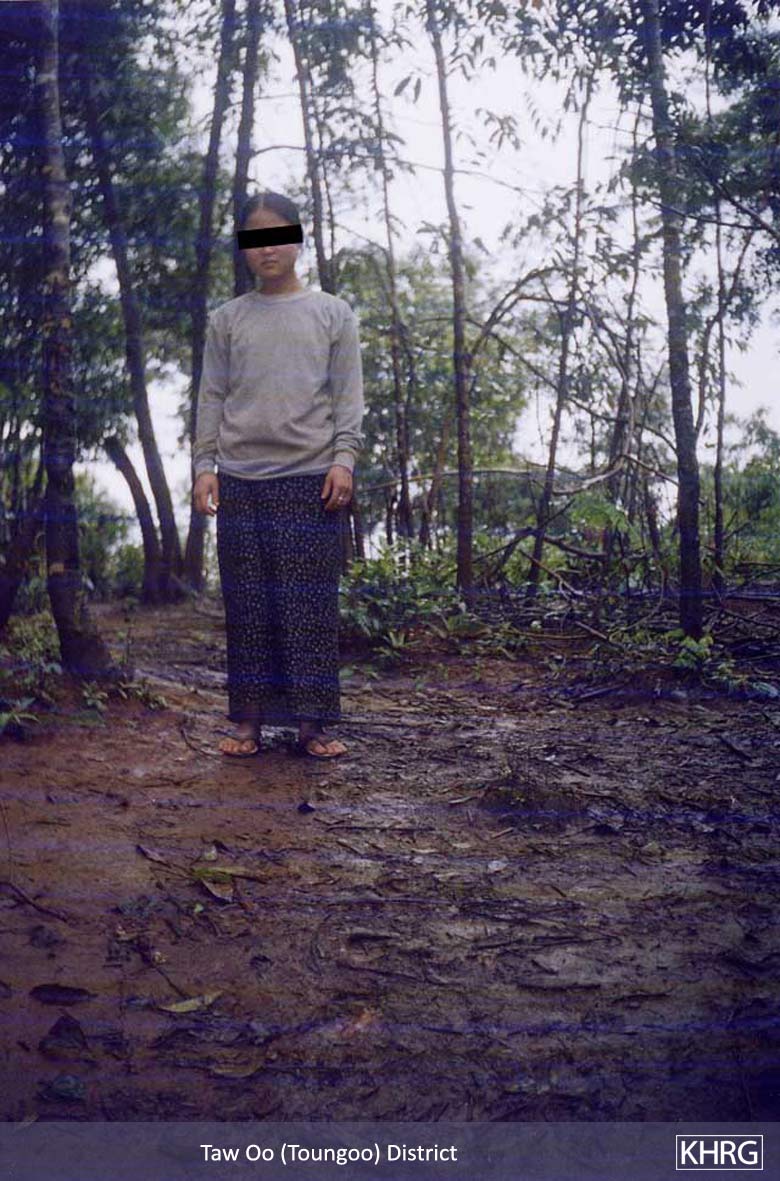 Photos #5-45, 5-46, 5-47: On October 19 th 2002, soldiers from LIB #1 Column 2 (Battalion Commander Myo Myint commanding) saw 35 year old villager Saw Khin Maung Myint along the vehicle road and shot him dead on sight. He lived with his wife and two children in D--- village, Bu Tho township, Papun District. Photo 5-45 shows his final resting place where his friends came to bury him beside the car road a couple of days after his death. Photo 5-46 is of his wife, Naw D---, who is too heavily pregnant to be able to work in their hill field to provide food for her children. Instead, her younger brother Pa G--- shown in Photo 5-47 now has to provide for the family, though he is only 12 years old. [Photos: KHRG researcher]