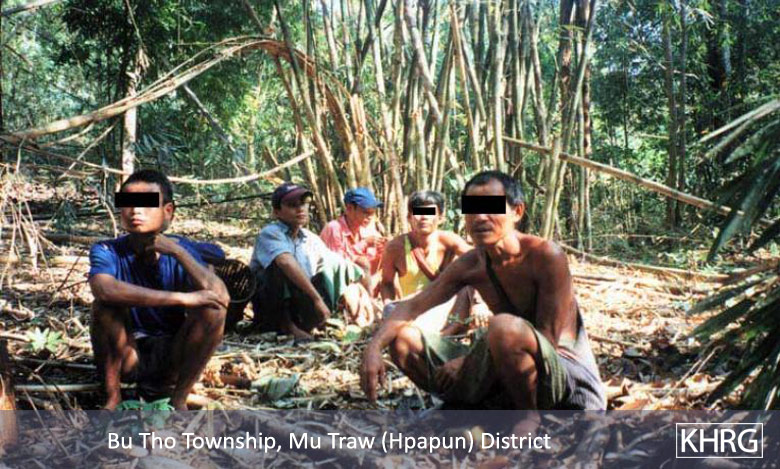 Photo #10-100: These villagers from P--- village, Bu Tho township, Papun district decided to leave in April 2003 and build a hut in the hills because the SPDC troops in their area always forced them to porter and stole their livestock. Here they are stopping on their way to eat some rice they brought along. [Photo: KHRG researcher]