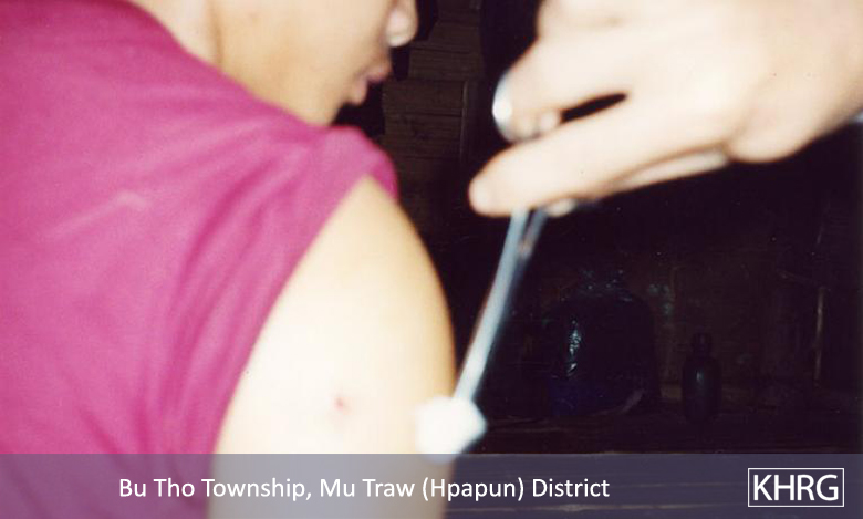 Apart from traditional remedies, the only treatment available to most Karen IDPs comes from KNLA medics or mobile medical teams sent by local relief organisations (see photos 10-143 , 10-144 to 10-145 , 8-8 , 9-23 , 8-9 , 9-24 , 10-149 to 10-150 , and 10-151 to 10-153 ). These medics cannot always reach IDPs in all areas (see photos 8-14 and 11-48 to 11-49 ) and their presence is sporadic, so people with serious wounds such as landmine victims must usually be carried for several days to reach a medic, dodging SPDC columns and landmines all the way (see photos 11-16 to 11-18 and 11-47 ). Even if they can be reached before the patient dies, these medics are often short of medicines and dressings. Photos 11-16 to 11-18 , for example, show an amputation being performed without anaesthetic on a Karenni landmine victim, who had already been carried several days from southern Karenni (Kayah State) to northern Karen State to reach medical help.
