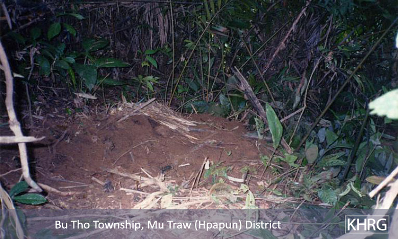 As long as SPDC forces continue trying to depopulate the area, the villagers are at constant risk of being shot or executed by SPDC columns, especially when they return to their villages and fields (see photos 10-57 to 10-58 , 5-13 , 5-20 to 5-22 , and 5-26 to 5-27 ). Some have been shot at many times over their years of on-and-off displacement (see photo 5-74). Landmines are also a constant threat (see photo 9-14 ). Villagers act to reduce these threats by establishing two-way communication with KNLA units in their area, giving information on events in and around their village in return for information on SPDC movements. This is facilitated by long-standing relationships between village leaders and local KNLA officers, who do not rotate between regions like SPDC officers do, and by the fact that many villagers have relatives in the KNLA. When SPDC columns are in hot pursuit, villagers sometimes call in the KNLA for protection (see photos 10-40 to 10-42 , 10-56 , and 10-57 to 10-58 ). Some KNLA units have even given IDPs homemade landmines to use in protecting their hiding sites, though as photo 11-44 shows this can create more suffering than protection.