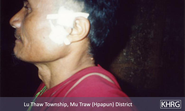 Photos #5-61, 5-62: Fifty-five year old Saw T--- had to flee his village in Lu Thaw township, Papun District and live at an IDP hiding place in the hills because of SPDC campaigns to depopulate villages. On July 2 nd 2002, he and his 19 year old son Saw P--- were returning from visiting Saw P---'s grandmother at T---. When they were crossing the Pwa Ghaw – Saw Hta military access road (see map ) near the already destroyed village of S---, SPDC soldiers saw them and immediately shot at them with small arms and mortars. Saw T--- received numerous wounds to his head and legs as shown in the photos. His son was not as seriously injured and was able to go for help, returning later with villagers who carried Saw T--- to safety. Saw T--- told KHRG, "I am only a villager. I do not work against them [the SPDC], but they shot at my son and I. We were both injured. My son wasn't hurt so badly, so he went to get people to carry me." This photo was taken in early August 2002. [Photos: KHRG researcher]