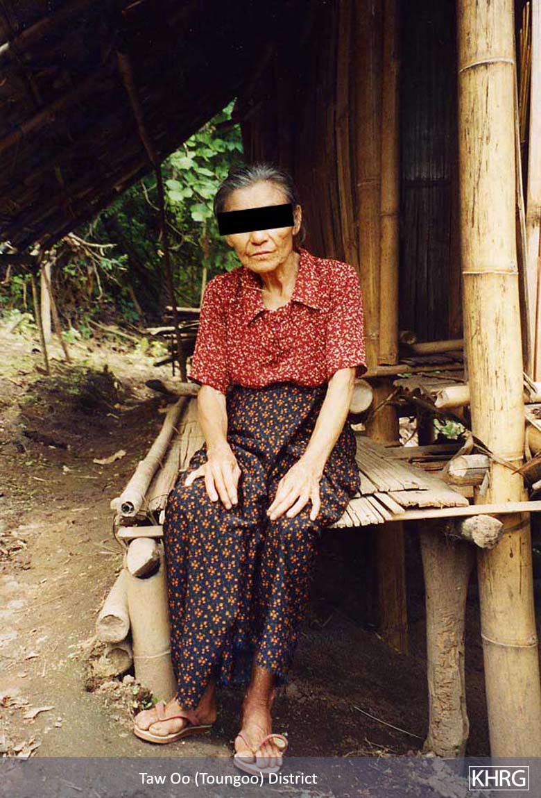 Photo #5-74: Saw M---, age 57, says he has been internally displaced and on the run from SPDC troops for over ten years in the hills of Toungoo District near his home village of M---. During that time he has been shot at by SPDC troops several times. In 1995 he was fleeing from IB #26 when he was shot in his left hand. In 2002 he was shot at again, this time by soldiers from IB #92, but was lucky to avoid injury. This photo was taken in April 2003. [Photo: KHRG researcher] Photo #5-76: Naw G---, 70 years old, from K--- village in Toungoo District, lost her 25 year old son Saw Po Htoh in June 1999 when he was shot dead by soldiers from SPDC LIB #439. Living alone as an internally displaced villager in the forests of Toungoo District, she must struggle daily to find enough food to eat. This photo was taken in June 2004. [Photo: KHRG researcher]