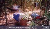 Photos # 10-134, 10-135, 10-136, 10-137, 10-138 These villagers in Thaton township of Thaton district left their villages to escape excessive demands for forced labour, money and goods from SPDC and DKBA forces in their area, and now live in the forest where these photos were taken in February 2005. To survive they make and sell roofing thatch. The girl in photo 10-135 has just set down a large basket used to gather leaves for thatch-making. The woman in photo 10-134 is shaving bamboo to make sticks for frames and ties to weave the shingles together, which is being done by the woman in photo 10-136. In most of the photos, piles of leaves and completed thatch shingles can be seen surrounding the villagers. Each day they must make hundreds of these shingles just to make enough to buy daily rice. It is also a dangerous living; if found living here in the forest by an SPDC or DKBA patrol, they would be rounded up and taken to an Army camp for an indefinite time doing forced labour. Photos # 1-5, 1-6 When LIB #589 came into the Yah Aw area of Shwegyin township and burned Klaw Lu village (see photos 1-1 through 1-3), everyone in Klaw Lu, K’Hee Day and Khaw Hta villages fled into the forest. Two days later on November 20th 2004, these photos show some of them after returning to their villages to retrieve some of their rice supplies so they can survive in the forest.