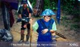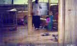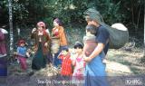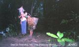 As can be seen in many of the photos below, everyone takes part in transporting needed food and belongings when on the move, even small children. Families and neighbours try to stay together, but families often become separated and must look for each other. When SPDC troops came to Naw K---'s village to threaten the villagers, most of the village men were away and the women had to transport everything into hiding, including the children (see photos 10-123 to 10-128 ). With the need for mobility, elderly and disabled villagers often become separated from the rest (see photo 1-4 ), or are left hidden somewhere while the others move on ahead, like the two elderly women in photo 10-61 .