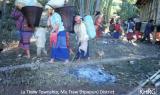Photos #10-47, 10-48, 10-49, 10-50, 10-51, 10-52, 10-53, 10-54, 10-55, 10-56: Villagers throughout Lu Thaw township of Papun district fled their villages as mobile SPDC columns sought to catch them in their villages in January 2004. The people of K--- village fled on January 8 th (photos 10-47 and 10-48 ); from L---, M---, and T--- villages also on January 8 th (photos 10-49 through 10-51 ); from P--- village, on January 11 th ( photo 10-52 ); from K--- village on January 18 th ( photo 10-53 ); and from H--- village on January 18 th (photos 10-54 and 10-55 ). Photo 10-56 shows some of the displaced villagers who have gathered at one hiding site arriving to meet with local KNLA officers to get information on SPDC movements and to request medicine for the sick. [Photos: KHRG researcher]