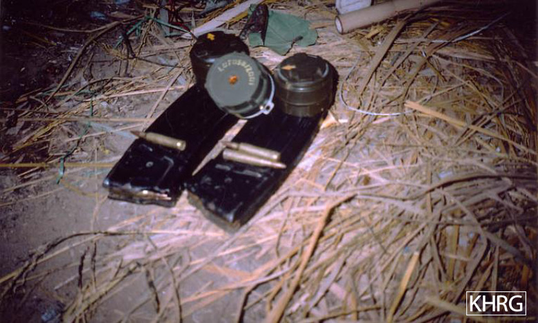 Photo #1-27: On returning to the ruins of their houses in Khaw Hta in early December 2004 (see photos 1-23 through 1-26 ), the villagers found these three landmines and two ammunition clips for MA1 assault rifles (standard Burma Army equipment), apparently left behind accidentally by SPDC soldiers. SPDC columns often landmine villages after burning them, to prevent villagers being able to return. [Photo: KHRG researcher]