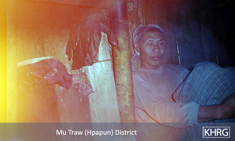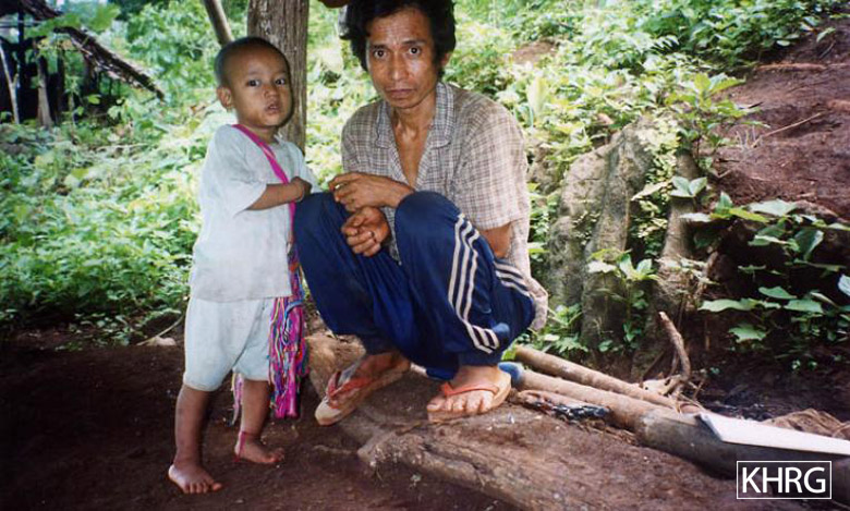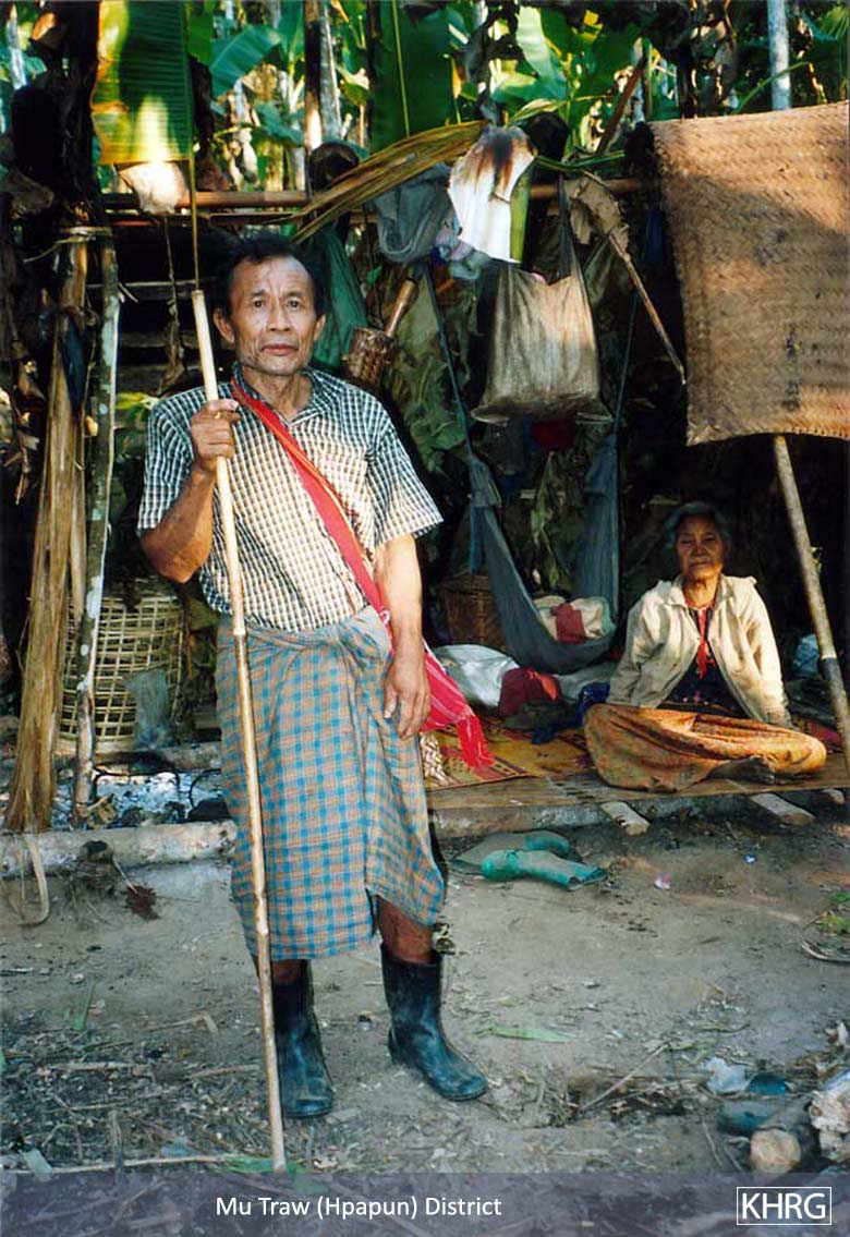 Photo #3-3: Saw T---, age 40, from T'Nay Hsah township, Pa'an District fled to a refugee camp in Thailand with his family after DKBA soldiers relocated them and planted landmines in their village. On May 16 th 2004, soldiers from DKBA #999 Brigade Special Battalion forcibly relocated a number of villages in T'Nay Hsah township of Pa'an District to nearby Wah Klu Pu village. After the villagers had been relocated the soldiers planted many landmines on the paths leading into their home villages and in the villages themselves to deter the villagers from returning. As a result, the villagers no longer dare to return to their homes to collect their food or any of their belongings for fear of stepping on one of the mines. This photo was taken in July 2004. [Photo: KHRG researcher]