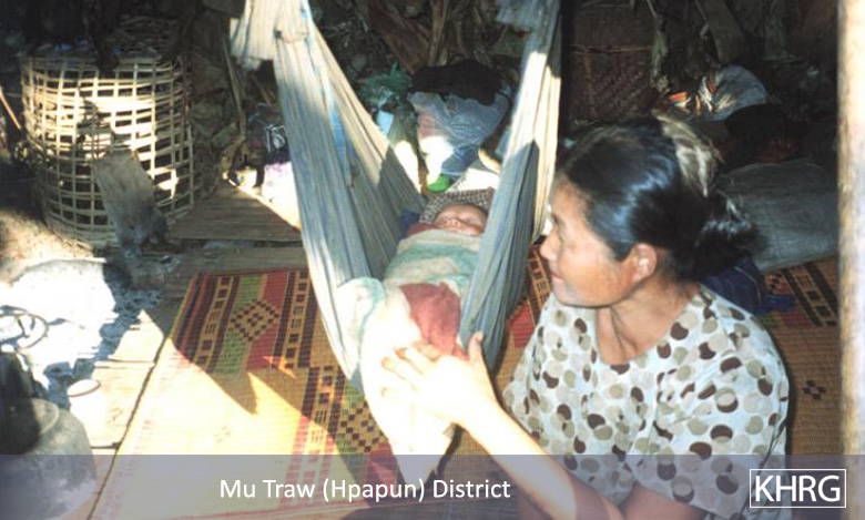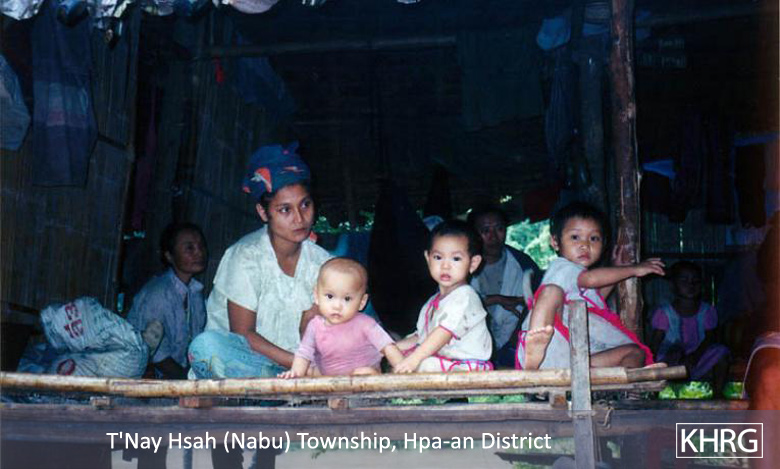 Photos #10-85, 10-86, 10-87: Villagers on the move in T'Nay Hsah township, Pa'an district, in September 2003. They are among a group of 180 people in 30 families who fled villages in T'Nay Hsah township after SPDC LIB #706 Column 2 (Major Kyaw Thu Ra Win commanding) and DKBA units from Brigades 333, 555 and 999 came to establish four new camps at Po Thwee Kyo, Wah Mi Kyo, Thay Daw Kyu Htoo and Tee Wah Klay beginning in July 2003. Villagers from ten villages in the area were forced to use their elephants to haul logs, build the camps, and carry ammunition and supplies to the troops, who also began looting livestock from the villages. Worst of all according to the villagers, they laid landmines which killed over 20 of the villagers' cattle and buffaloes and made the villagers afraid to walk to their fields or in the forest. Most of them therefore fled into the mountains or toward the Thai border. In photo 10-87 , an internally displaced mother and her children share a pot of rice porridge in an attempt to make their rice supply last as long as possible. [Photos: KHRG researcher]