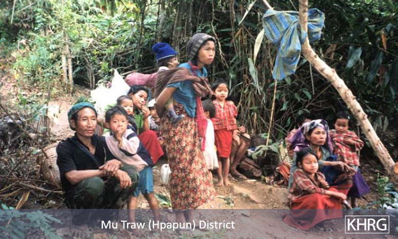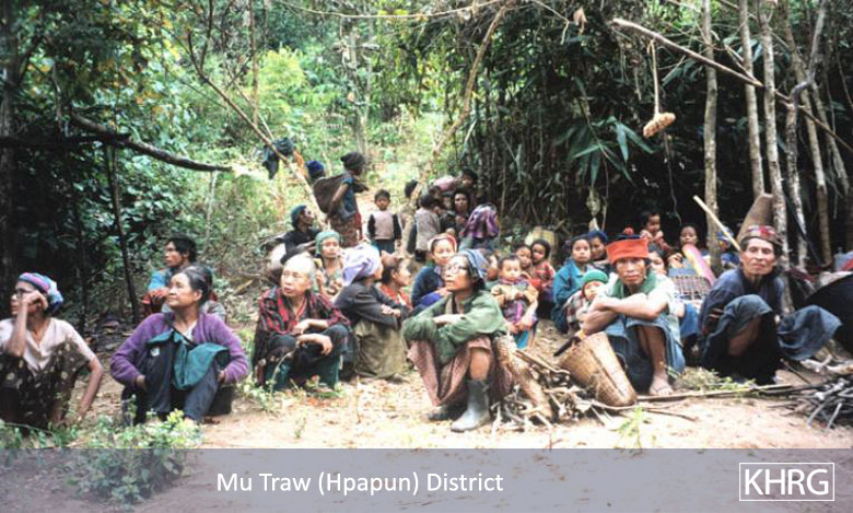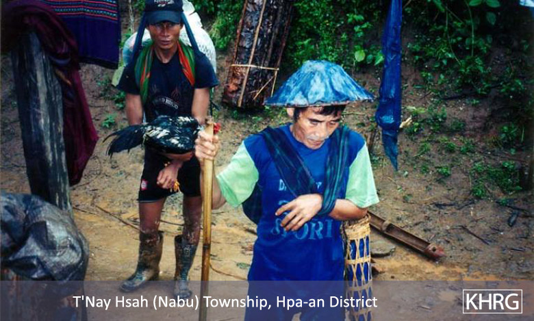Photos #10-57, 10-58: These internally displaced villagers live in an area of Papun district where three columns of SPDC Light Infantry Division #55 are active. On January 18 th 2004, they went to collect some of their food stored back at their home village of T---. On the way back to their hiding site, a patrol from SPDC Light Infantry Division #55 sighted them and opened fire on them, forcing them to drop many of their loads and run. A cattle trader with the group had a walkie-talkie and contacted the KNLA for help, so a KNLA unit went and met them at L--- and escorted them the rest of the way. Along the path the KNLA soldiers had to remove several SPDC landmines. These photos show the villagers on the way back, with KNLA soldiers guarding alongside the path. [Photos: KHRG researcher]