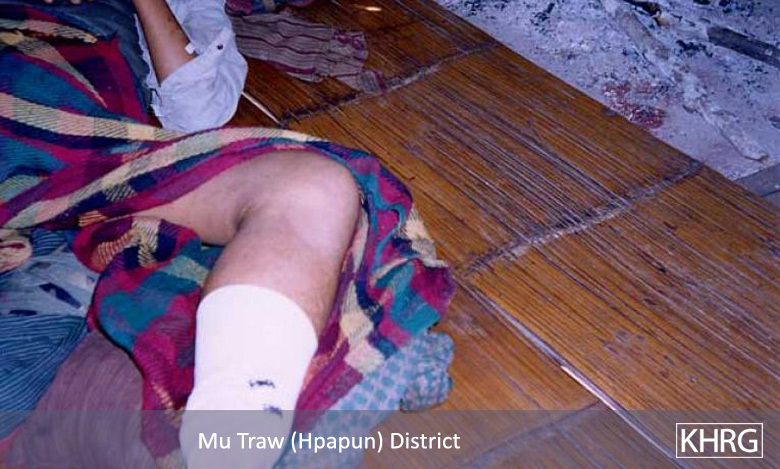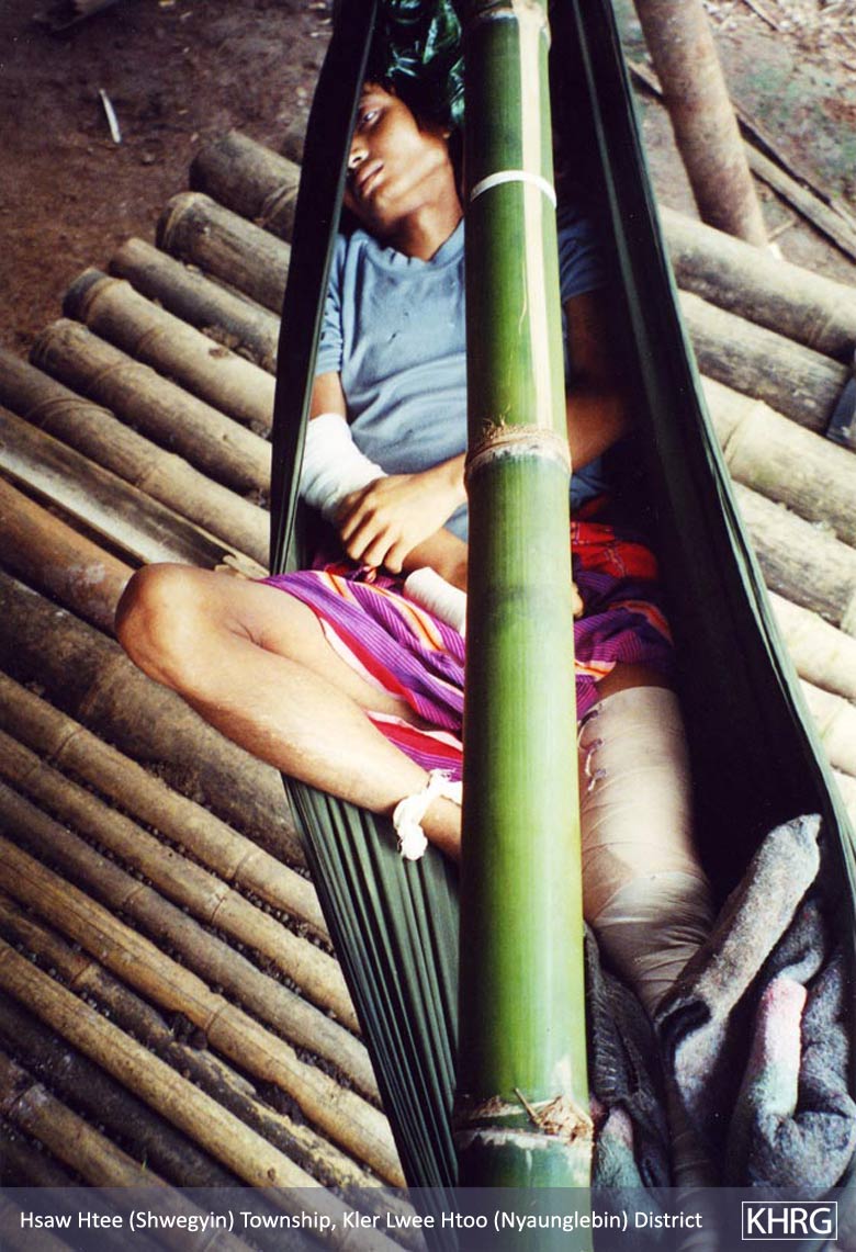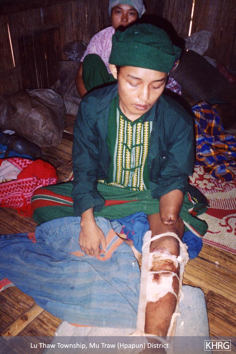 Photo # 11-45: Saw P--- from T--- village in Nyaunglebin District lost his leg while carrying rice from Mu Theh for the SPDC on October 3 rd 2002. This photo was taken two weeks later as he was receiving medical attention from Karen medics. Villagers seriously wounded while portering for SPDC forces are often left to die rather than being given treatment. [Photo: KHRG researcher] Photo #11-46: On July 16 th 2002, 18 year old Naw N--- from T--- village in Dta Greh township of Pa'an District stepped on a DKBA landmine, blowing off the lower portion of her right leg. She was returning home with rice from her paddy field at 8 a.m. when she stepped on the mine near a small bridge at O---. According to a KHRG researcher in the area, the mine was probably planted by troops under Company Commander Pa Kyaw Nyo of DKBA #999 Brigade Special Battalion. [Photo: KHRG researcher] Photo #11-47: On June 21 st 2002, an SPDC unit found the IDP hiding site at L--- in Shwegyin township, Nyaunglebin District, sending the villagers fleeing deeper into the forest. They left later that same day, but not before planting a number of landmines in and around the site. The following day, 35 year old Saw Lweh Po stepped on one of these landmines while trying to catch some fish for his wife and four day old baby in a nearby stream. His two companions who were with him at the time carried him back to the IDP site, but were unable to treat him as they had no medicine. They put him in this hammock slung from a bamboo pole and carried him eastward through the hills for five days to a KNU clinic, where this photo was taken on the afternoon of June 29 th , 2002. He died two days later. [Photo: KHRG researcher] Photos # 11-48, 11-49: Saw K---, 38 years old from T--- village in Lu Thaw township, Papun District. On June 8 th 2002 he stepped on an SPDC landmine planted by Light Infantry Division #101 in the forest near D--- village. He was never able to receive proper treatment or medicine, so when this photo was taken in January 2003 his wounds had still not properly healed. [Photos: KHRG researcher]