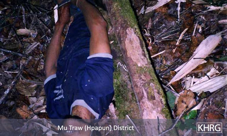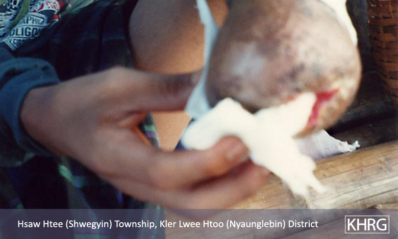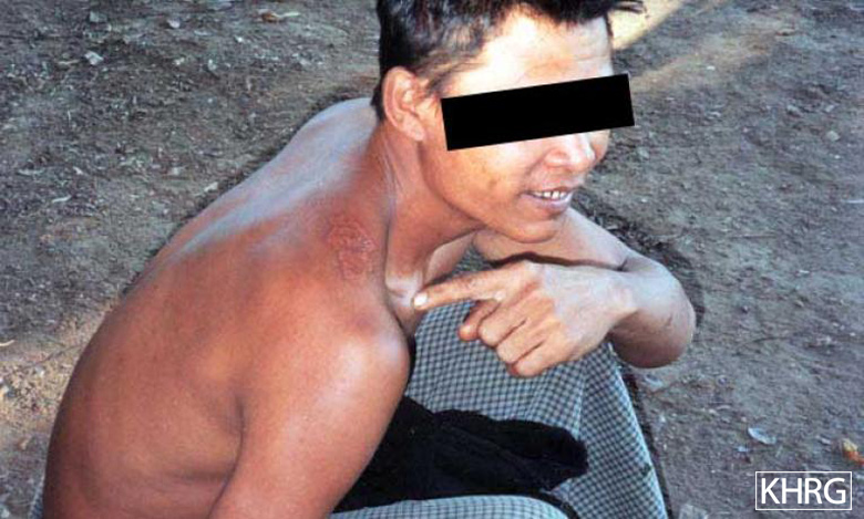 Mines also pose an indirect threat to villagers, because whenever SPDC soldiers or vehicles are hit by a KNLA mine they punish local villagers in retaliation. Photos 4-1 to 4-7 and 4-8 to 4-10 provide one such example, when SPDC forces arrested and brutally tortured twelve villagers after a KNLA mine destroyed one of their trucks. Three of the villagers died under torture, while among the others one had his eye gouged out and others were repeatedly asphyxiated or set on fire.