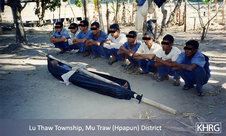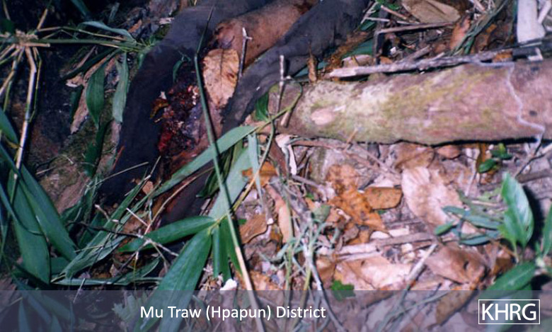 Photos #11-40, 11-41: These ten convict porters, most of them still in blue prison uniform, escaped from Light Infantry Division #99 in January 2003. As they were fleeing, one of their group was killed after stepping on a landmine near T--- village in Lu Thaw township, Papun District. The others tried carrying their wounded friend to help, but he died before they could find any. His body was left behind as the other surviving convicts continued searching for help. Only after being found by a KNLA patrol were they able to return and retrieve their friend's body for burial. [Photos: KHRG researcher]