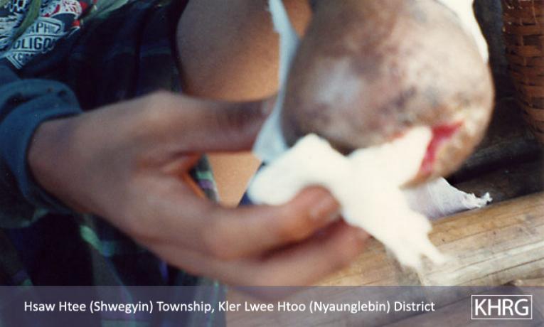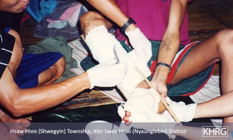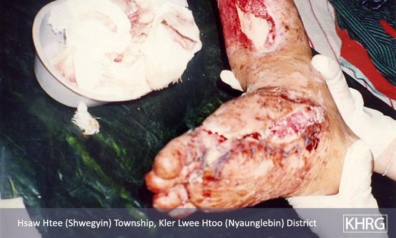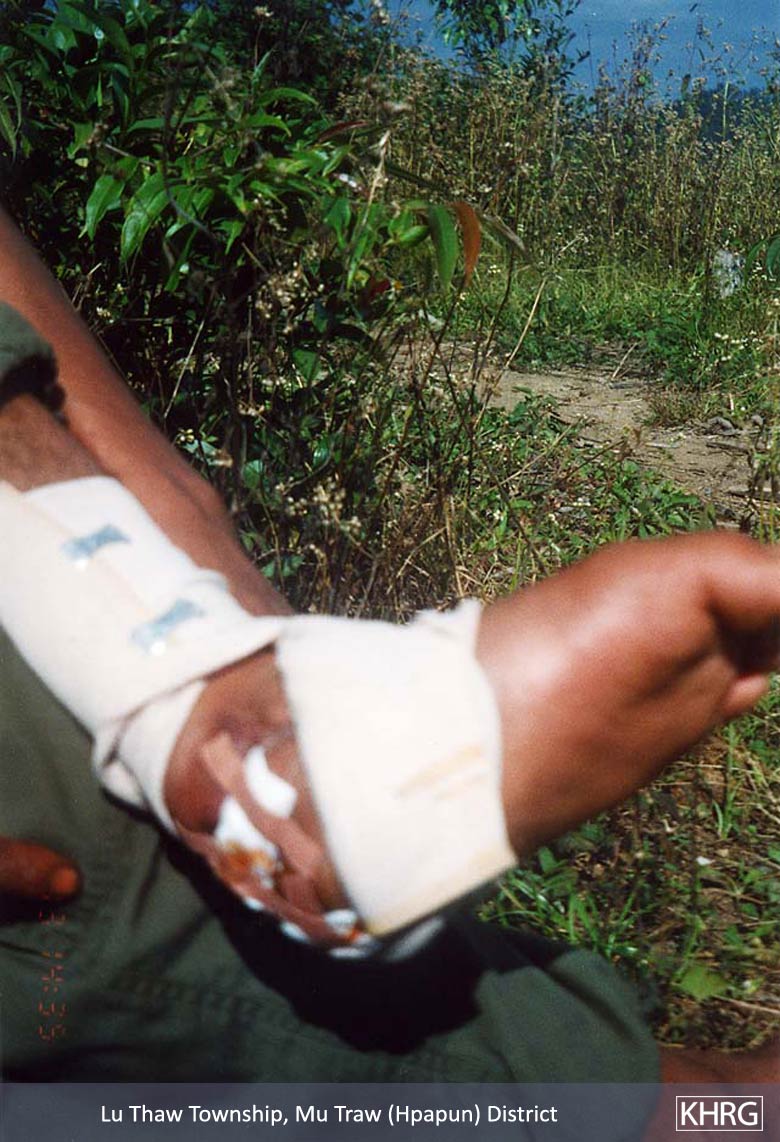 Photos #11-20, 11-21, 11-22, 11-23, 11-24: Early on the morning of December 30 th 2003, SPDC soldiers from Light Infantry Division #55 found and burned a paddy storage barn containing approximately 100 baskets [2,500 kgs. / 5,500 lbs.] of paddy which displaced villagers had hidden near K--- village in Lu Thaw township, Papun district. Later that morning some villagers went to the site to see what rice they could salvage, accompanied for protection by 18-year-old Saw S--- from M--- village, who is a member of the KNU's Karen National Defence Organisation (KNDO) militia. When they reached the destroyed paddy barn at 11:45 a.m., Saw S--- stepped on a landmine the SPDC soldiers had planted there before leaving, presumably to kill anyone who came back for the rice. The mine blew off Saw S---'s right foot and mangled his left leg. Photo 11-20 shows all that remained of his right shoe after the blast. Photos 11-21 through 11-23 were taken as he received treatment from a mobile team of Karen medics a week later on January 8 th 2004. In Photo 11-24 , one of the medics displays just one of the pieces of shrapnel removed from Saw S---'s leg. [ Photos: KHRG researcher]
