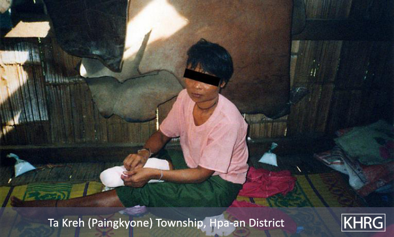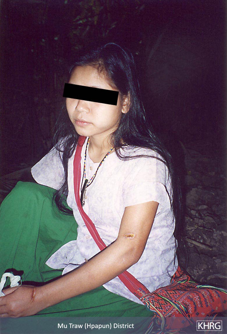 Photos # 11-37, 11-38, 11-39: On January 4 th 2003, SPDC LIB #341 (Kyaw Mya Thaung commanding) ordered villagers from P--- and K--- villages to carry Army supplies from Hsaw Bweh Der to K'Hee Kyo Army camp in Bu Tho township of Papun District. These girls aged 12, 15, and 20 were part of the group, which had to leave Hsaw Bweh Der at 7 a.m. The soldiers who were supposed to accompany the villagers set out for K'Hee Kyo through the forest, but ordered the villagers to walk along the vehicle road, apparently suspecting that the road may be mined. Shortly before arriving at K'Hee Kyo camp one of the villagers hit a tripwire, detonating a claymore mine placed there by the KNLA. Nine of the villagers were wounded. Photo 11-37 shows Naw A---, age 12, who was hit by shrapnel in the shoulder, left arm, left wrist, and under her breast; medics were later unable to remove the shrapnel, and a month later she said it still made her dizzy often. Beside Naw A--- in Photo 11-38 is Naw B---, 15 (left), who was wounded in the bladder; both girls are shown in school uniform. Photo 11-39 shows 20 year old Naw M---, who sustained shrapnel wounds to her left thigh. Four others were injured more seriously and were sent to the SPDC hospital in Papun town. The use of villagers as human minesweepers is a common SPDC tactic throughout all areas of Karen State. [Photos: KHRG researcher]