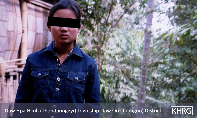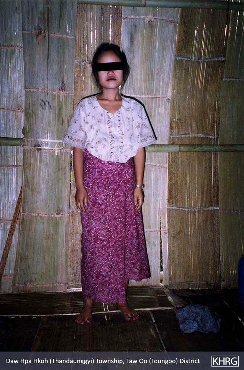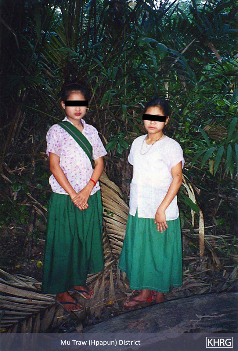 Photos # 6-105, 6-106: Naw P---, 20 (left) and Naw M---, 21 (right), two villagers from K--- village in Than Daung township, Toungoo district, who were among those forced to cut scrub along the sides of the road for SPDC LIB #439 Column 1 (Battalion Commander Aung Htay Win commanding) on December 23 rd 2004. While they were clearing the scrub, one of the other villagers stepped on a landmine. [Photos: KHRG researcher]