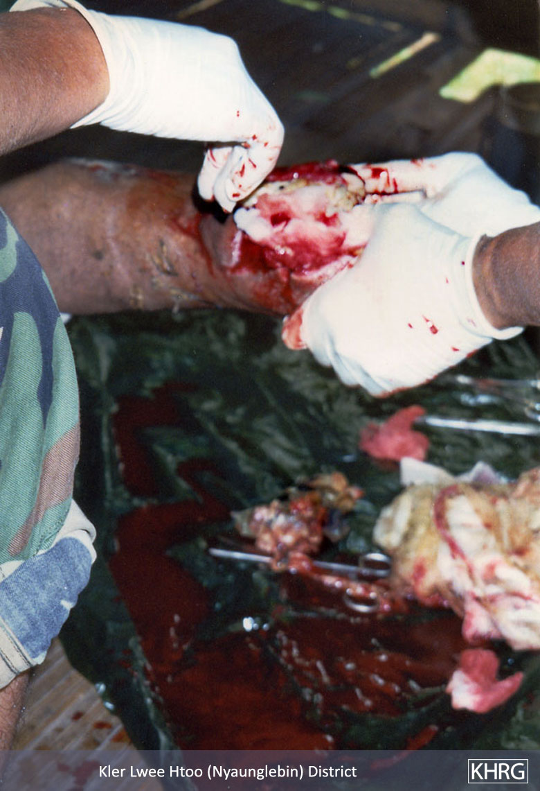 Photos # 11-32, 11-33, 11-34, 11-35, 11-36: On August 11 th 2003 Saw H---, a 17-year-old from B--- village in southern Karenni (Kayah) State, stepped on a landmine planted near his village by SPDC-allied Karenni Solidarity Organisation (KnSO) soldiers commanded by officer Hsa Wah. It was not until two months later that he reached this KNU clinic in Papun District, where this photo was taken. The medics decided his lower leg (shown in photo 11-32 ) could not be saved. The remaining photos show stages of the amputation, which is done with only the simple medical tools available and without general anaesthetic. Many of those who step on landmines die from loss of blood or shock long before they can be either taken to medical care or wait until it reaches them. KnSO mines are also involved in photos 11-16 to 11-18 and 11-19 . [Photo: KHRG researcher]