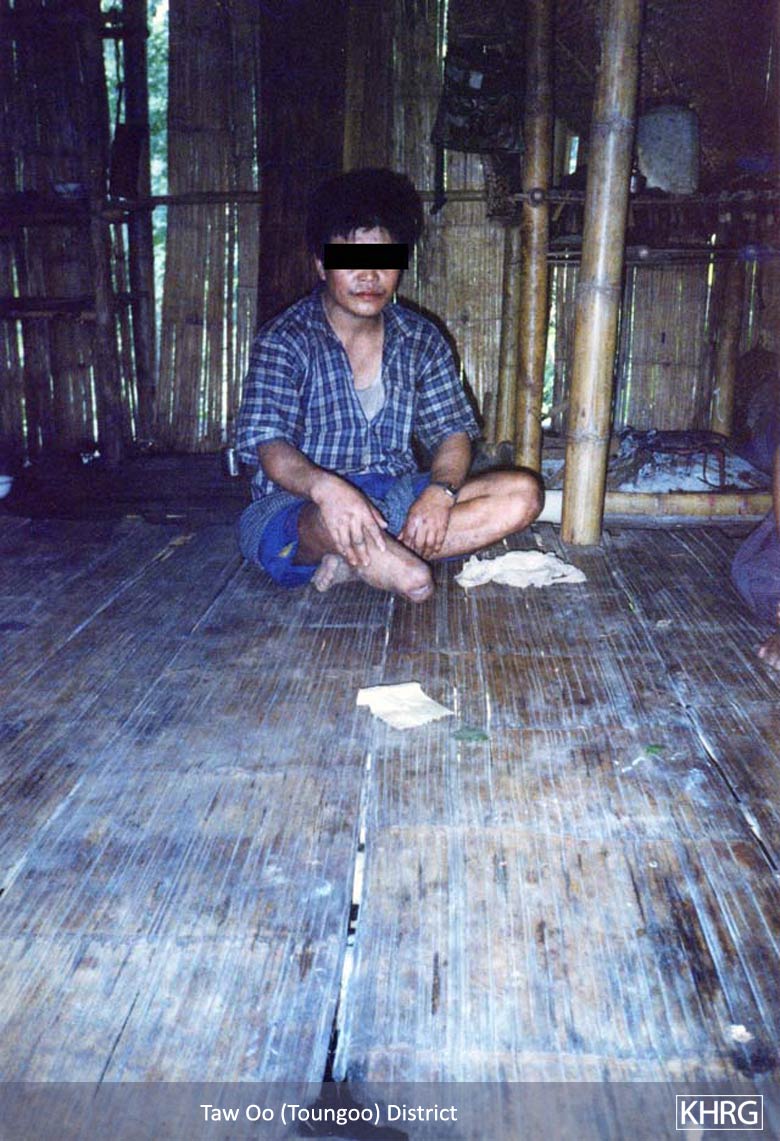 Photo # 11-50: 46 year old Saw K--- from N--- village in Than Daung township of Toungoo District lost his son to an SPDC landmine. Major Aung Ko Lin, battalion commander of IB #53, acting under the direct orders of Captain Thet Oo, Operations Commander of Southern Regional Military Command's Strategic Operations Command #3, planted many landmines along the banks of the Klay Loh River in early 2002. Saw K---'s son Saw Si Si Htoo was only 14 when he was killed outright by one of these mines while fishing in the Klay Loh River on April 26 th 2002. [Photo: KHRG researcher] Photo #11-51: Saw K---, 39, from G--- village in Toungoo District lost his leg to a landmine when performing forced labour for the SPDC on March 11 th 2002. Soldiers from IB #264 ordered him to cut small logs and bamboo for use in repairing buildings in T--- army camp and he stepped on one of their landmines near the camp perimeter, blowing off his right leg. This photo was taken in July 2002. [Photo: KHRG researcher]