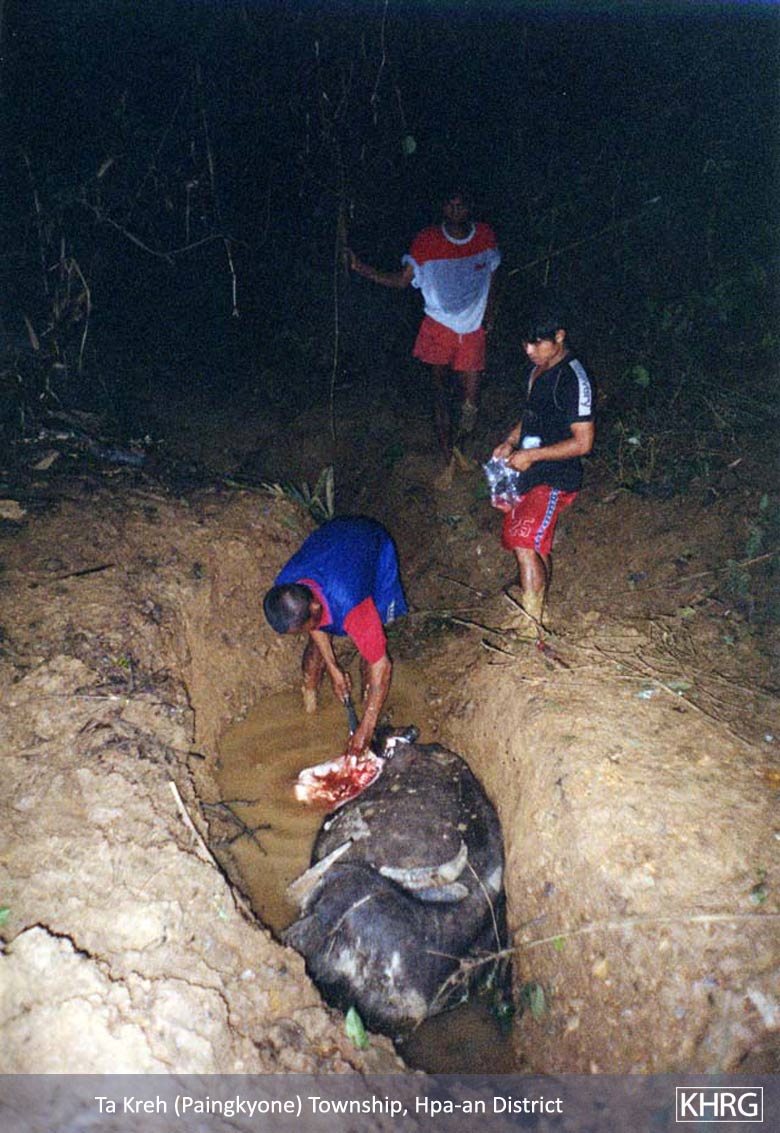 Photo #11-53: People are not the only victims of landmines in Karen State. It is quite common for buffaloes, cattle, and elephants to lose their limbs or lives to landmines. On October 29 th 2002, this buffalo owned by Saw M--- from B--- village, Dta Greh township in Pa'an District stepped on an SPDC landmine beside the Moei River, dying later that same day. No compensation was paid to the owner. [Photo: KHRG researcher]