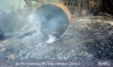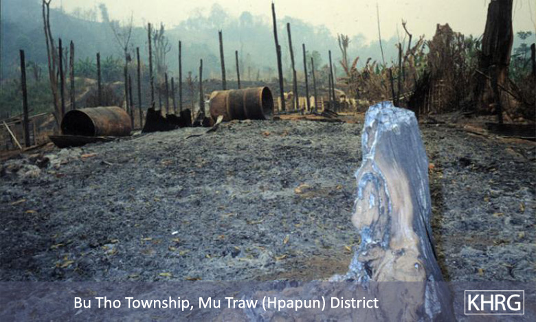 Photos #2-15, 2-16, 2-17: The smouldering remains of Ho Kay village in Bu Tho township of Papun District. On March 4 th 2003, SPDC Army soldiers from IB #14 and LIB #6 led by battalion commander Thein Htun burned the entire village to the ground. Photo 2-16 is of some of the still-smouldering unhusked rice that was destroyed, while photo 2-17 shows some KNLA soldiers checking for any landmines that may have been planted there by the departing attackers. SPDC forces often mine villages they have burned to discourage villagers from returning and thus induce them to move to SPDC-controlled relocation sites. These photos were taken in March and mid-April 2003. [Photos: KHRG researcher]