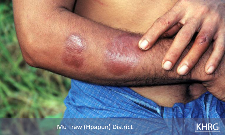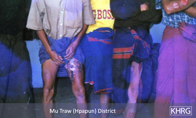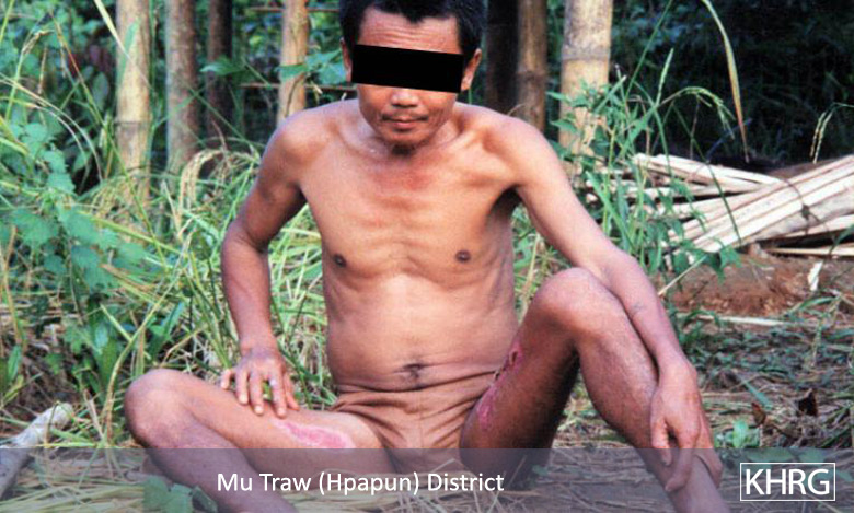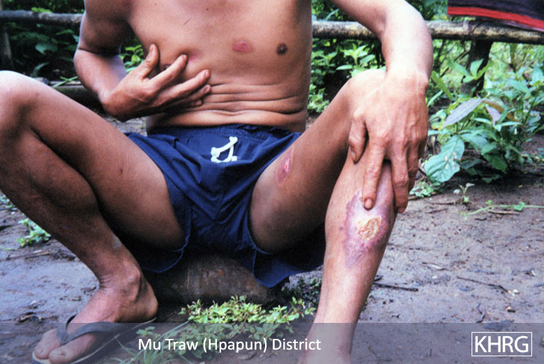Photos # 4-1, 4-2, 4-3, 4-4, 4-5, 4-6, 4-7: In early August 2003, an SPDC Army truck was destroyed by a mine while travelling on the road south of Papun town close to the villages of K---, N---, and T--- which straddle the border between Bu Tho and Dweh Loh townships of Papun District. Soldiers from LIB #340 commanded by Myint Win Aung went into these three villages in the middle of the night on August 9 th and arrested eleven villagers, accusing them of being responsible for planting the landmine. All eleven villagers were taken to the Army camp and interrogated. All of them were beaten, tortured, cut with knives, and burned to varying degrees. Three of the men, all from K--- village, were killed: Saw Pa Shwe Heh was killed on September 19 th , while Saw Pa Kheh and Saw Pa Kwa Hser were killed four days later on September 23 rd . The men who survived the ordeal claimed that deputy battalion commander Maung Maung Aung and company commander Nga Moo were responsible for the killings. Saw K---, 40, from N--- village ( photos 4-1 and 4-2 ) was detained for six weeks at the Army camp, where he was interrogated, beaten, and tortured on a daily basis. The soldiers poured petrol on his chest, legs, and groin and burned him. They rolled an iron bar on his left shin until the bone fractured. His head was wrapped in a tarpaulin and the soldiers poured water over his face so that he could not breathe. These sessions usually continued until he lost consciousness. Photo 4-3 shows 35 year old Saw P---, from T---, who was beaten and kicked in the head by four soldiers wearing combat boots before having his right eye gouged out. After he was released on October 19 th , he had to pay for his own medical care; the soldiers did not provide him with any treatment. In all, his treatment cost him a total of 170,000 Kyat. Photos 4-4 and 4-5 are of Saw M---, 28 years old, from T--- village. He was kicked and beaten unconscious by five soldiers who then continued to kick and stomp on him until he shat himself. On more than one occasion, his head was wrapped in a soaked tarpaulin until he lost consciousness. On one occasion when he regained consciousness, the soldiers branded his right forearm with a hot iron, poured petrol on his chest and set fire to him. He was finally released on October 22 nd 2003. The SPDC paid nothing toward the 70,000 Kyat in medical costs that he accumulated afterwards. In photos 4-6 and 4-7 , several of the other detainees show the torture wounds all over their bodies. None of the men have been able to return to work because of their injuries. These photos were taken in September and October 2003. See also photos 4-8 through 4-10 below. [Photos: KHRG researcher] Photos #4-8, 4-9, 4-10: After the destruction of the SPDC Army truck mentioned above, this 45 year old village head from the area was summoned to a meeting on August 13 th 2003 in Papun town by operations commander Khin Kyu, where he was accused of having prior knowledge of the KNLA soldiers' movements and of complicity in the attack. He was then kicked and beaten under the orders of operations commander Khin Kyu. The soldiers smeared gunpowder on his thighs and set it alight, burning large patches of skin off his legs. These photos were taken a week after he was released on October 19 th 2003, after being detained for over two months. He was not provided with any treatment for his wounds by the SPDC. [Photos: KHRG researcher]