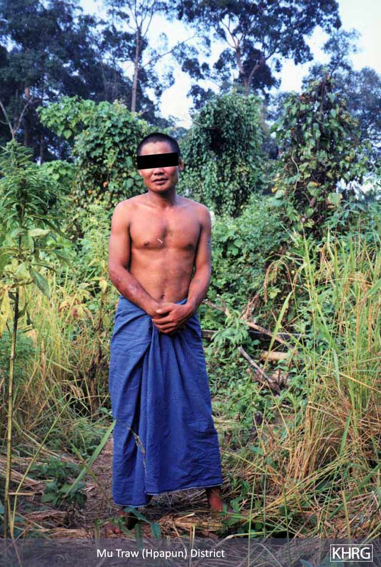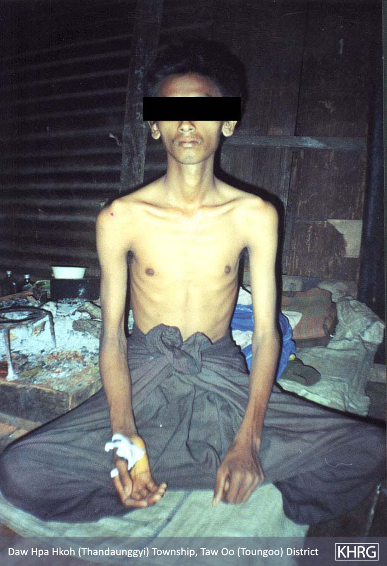 Photo # 6-93: A---, age 28, a painter from Rangoon, was arrested and imprisoned for selling illegal lottery tickets. He served only three months of his two year sentence in Insein prison before being transferred to Toungoo prison. He remained in Toungoo prison for only one week before being handed over to IB #124 based in Than Daung Gyi in Toungoo District of Karen State as a convict porter. IB #39 then took him as a porter to Kyo Ta Tan in Than Daung township for three months, during which time he was regularly beaten and forced to walk in front of the soldiers as a human minesweeper. Following this, he was reassigned to carry rations such as rice, salt, sugar, and tins of milk for IB #26. He was also forced to build the soldiers' huts with wood, bamboo, and thatch that he had to cut himself. Four of the nine porters working for IB #26 were beaten to death when they were no longer able to continue. Their names were Thein Htun, Tin Hlaing, Ya Goke, and Thein Zaw. Another porter, U Sein Htun, was shot dead by intelligence officer Captain Tin Hla. The surviving porters were forced to bury the bodies. During the time he spent with the soldiers, he was repeatedly kicked, punched, beaten with rifle butts, and once cut with a machete. Fearing that he too would soon die if he remained with the battalion, he fled in the middle of the night on February 17 th 2003. "Of the nine porters, five of them died. They [SPDC] forced them to work, beat them, and killed them. There was no medicine to treat them so they died. One of them was hit in the body until he died. Another was beaten to death with a gun barrel. They would hit me at least 20 times a day. I couldn't bear it anymore so I escaped. It took me for four days [to reach help]. I had no rice to eat. I was starving. The villagers looked after me and fed me." This photo taken in February 2003 shortly after his escape shows his emaciated and malnourished condition. [Photo: KHRG researcher]