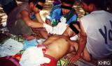 Many are killed outright by mines or bleed to death on the spot. If they survive, they must usually be carried several days' walk, slung in a hammock from a bamboo pole and dodging SPDC columns and mines along the way, to find the nearest KNLA medics or mobile medical team (see photos 11-16 to 11-18 , 11-32 to 11-36 , and 11-47 ). The medics themselves only have simple tools and medicines, so they clean the wound with alcohol or iodine, remove metal fragments with tweezers, cut away mangled flesh and amputate often without any anaesthetic (see photos 11-16 to 11-18 and 11-32 to 11-36 ). Some of the photos below are horrible to look at, but they are included to demonstrate the full horror of mines and their effects on people's lives.