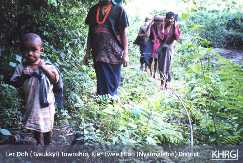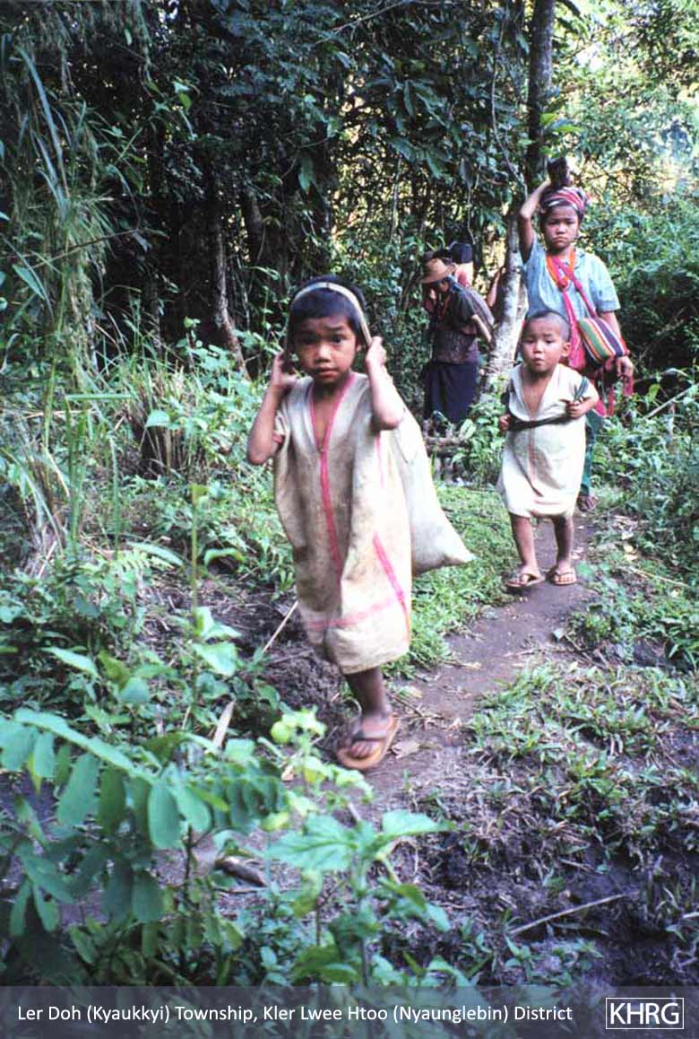 Photo #10-115: Internally displaced villagers from Thaw Ngeh Der village in Ler Doh (Kyauk Kyi) township of Nyaunglebin District. As a part of the SPDC's ongoing campaign to depopulate the hills of Nyaunglebin District, on October 5 th 2002 soldiers from LIB #175 entered their village and burned it to the ground, while all the villagers fled into the forest. This is not the first time that this had happened; three and a half years earlier in May 1999, a column of soldiers from IB #48 and IB #26 had done the exact same thing, burning the village and all food supplies to the ground. Theirs was only one of a dozen such villages that were destroyed. Over the past twenty years many villagers in Karen regions have gone through repeated cycles of village destruction by SPDC forces, life displaced in the forests, and gradual re-establishment of their villages only to have them burned again. This photo was taken three days after the attack on their village, when the people were returning to the village to rebuild their homes. See also photos 10-116 and 10-117 . Photos #10-116, 10-117: Children in Kyauk Kyi (Ler Doh) township, Nyaunglebin district, move through the forest with their families in October 2002 after SPDC units burned their farmfield huts and came to their villages. These children from Dta Kaw Der village were fleeing through the forest on October 9 th 2002 after SPDC troops had destroyed their village. See also photo 10-115 . [Photos: KHRG]