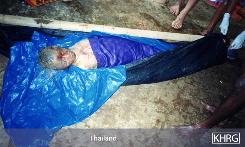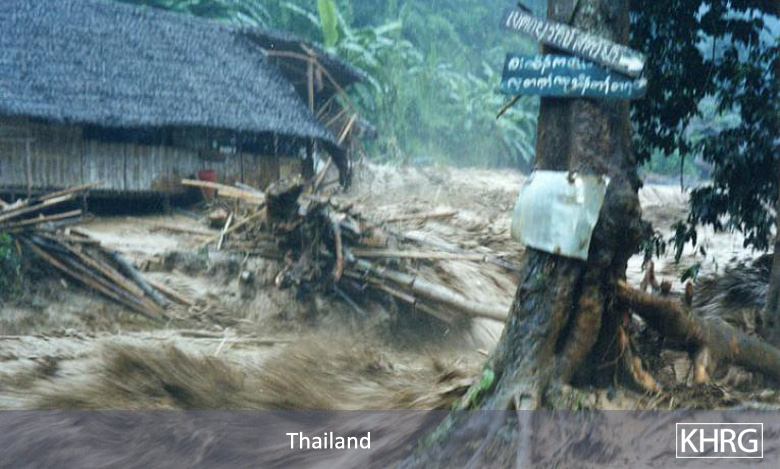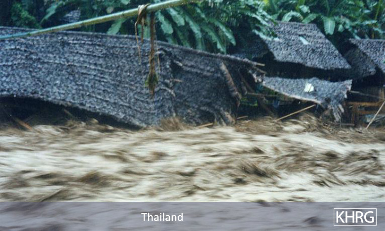 Photos #10-182, 10-183, 10-184, 10-185, 10-186, 10-187, 10-188, 10-189, 10-190, 10-191, 10-192, 10-193, 10-194: Villagers who manage to cross into Thailand, avoid forced repatriation by Thai authorities, and find their way into a Karen or Karenni refugee camp are still not safe. Since 1995, Thai authorities have consolidated the refugee camps and progressively moved them closer to the border (contrary to established UN refugee guidelines) and onto more unstable and unlivable terrain, as part of a deliberate policy to make life difficult and dangerous for refugees in the hope that they will decide to return to Burma instead. One result has been attacks by Burmese forces on unprotected refugee camps; another has been deaths by natural disasters due to the placement of refugee camps in steep and unstable gullies. On September 2 nd 2002, flash floods swept away houses in Meh Ka Kee (Mae Khong Kha) Karen refugee camp opposite northern Pa'an district, killing at least nine refugees. Photos 10-182 through 10-184 show the waters raging through the camp. Photo 10-185 shows all that remains of a house that stood in the way, and photo 10-186 shows the remains of the barracks for newly arrived refugees. Those killed included Naw Lah May, 17 ( photo 10-187 ); Saw Tah Pu Lu, 14 ( photo 10-188 ); Saw Hsa K'Pru, 26; Saw Kyaw Ta Muh, 19 ( photo 10-189 ); Naw Wah, 12 ( photo 10-190 ); Naw Lay Way Paw, 18 ( photo 10-191 ); Naw Mu Si Si, 10 ( photo 10-192 ); Saw Johnson Mu, 19 ( photo 10-193 ); and Saw Kyaw Htoo, 49 ( photo 10-194 ). The camp is built along steep and narrow gullies extremely vulnerable to flash floods and landslides. Making matters worse, when floodwaters rise Thai authorities sometimes open the dam upstream at Mae Sariang without notifying villagers or refugees downstream. This has caused deaths in villages near Meh Ka Kee in the past, though it is not confirmed whether it happened in this case. [Photos: KHRG]
