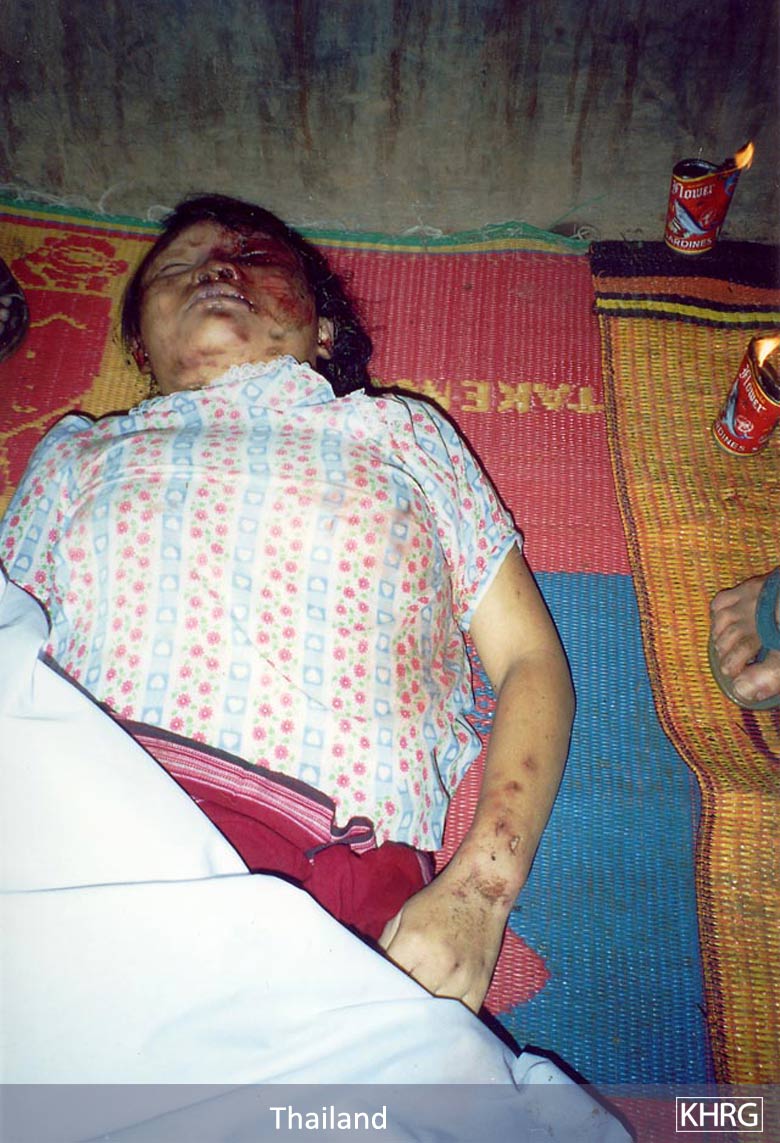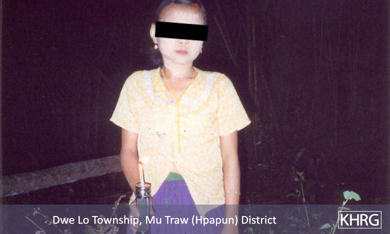 Photos #5-20, 5-21, 5-22: Saw Pa La Day, 50, from T--- village in Bu Tho township of Papun District was shot dead on sight by soldiers from SPDC Light Infantry Division #66 on May 30, 2003. His wife, Naw T--- ( Photo 5-22 , which has been damaged), must now raise their three young children alone. The SPDC has been trying to depopulate the hills of Bu Tho township since 1997 by burning villages and shooting villagers on sight. These photos were taken in June 2003. Photo #4-13: Naw N--- is a 33-year-old widow from W--- village in Bu Tho township of Papun District. On May 5 th 2003, soldiers from LIB #434 led by Myo Myint Hlaing were ambushed by KNLA soldiers not far from her village. The soldiers then entered the village and arrested Naw N---'s husband, 41 year old Pa M---, and accused him of complicity in the attack. Arbitrarily arresting local fighting-age male villagers in retaliation for ambushes is a routine SPDC Army procedure. During his interrogation at the SPDC Army camp nearby, Pa M--- was kicked, strangled, hung, stabbed in the legs with knives, and beaten to death. Their eldest daughter, 13 year old Ma M---, had to drop out of school in order to find work to help her mother raise money to support the family. This photo was taken in July 2003. [Photos: KHRG]