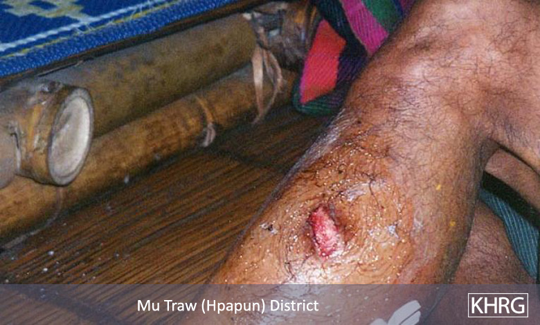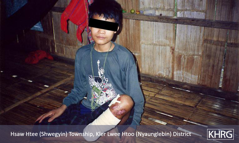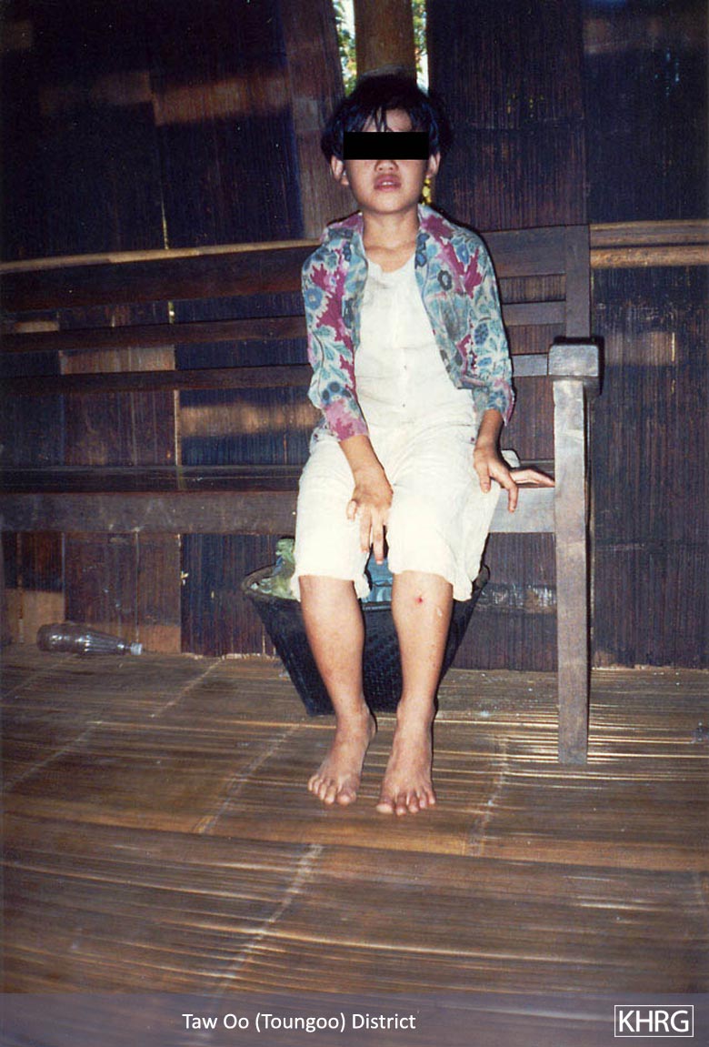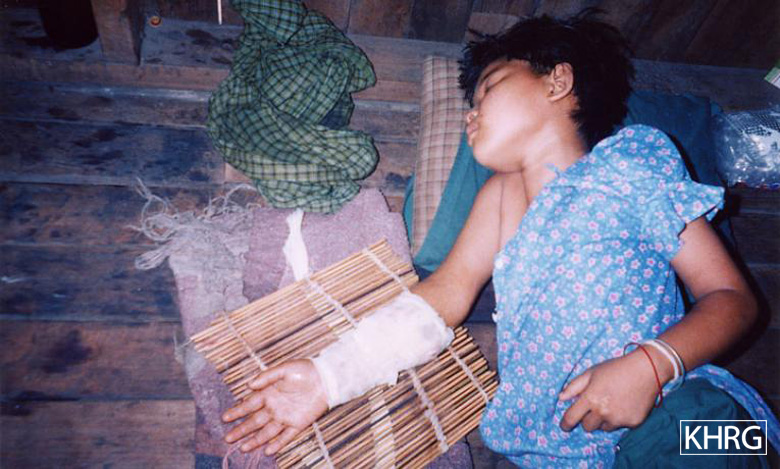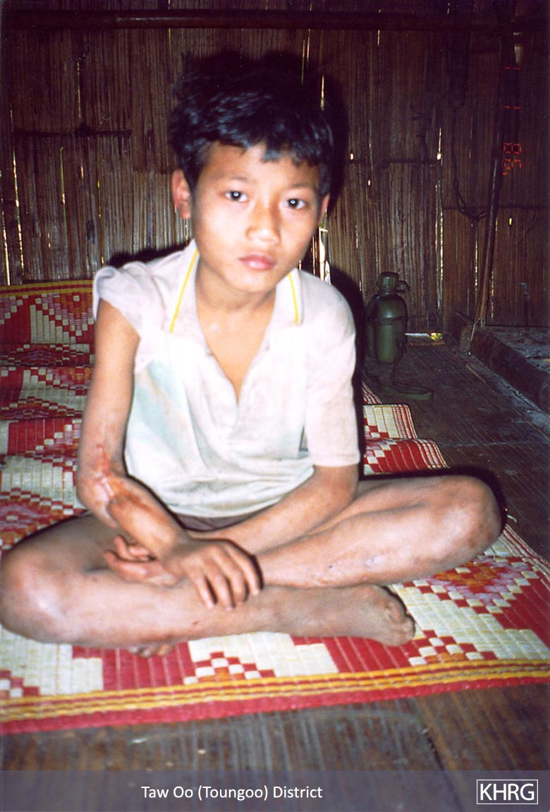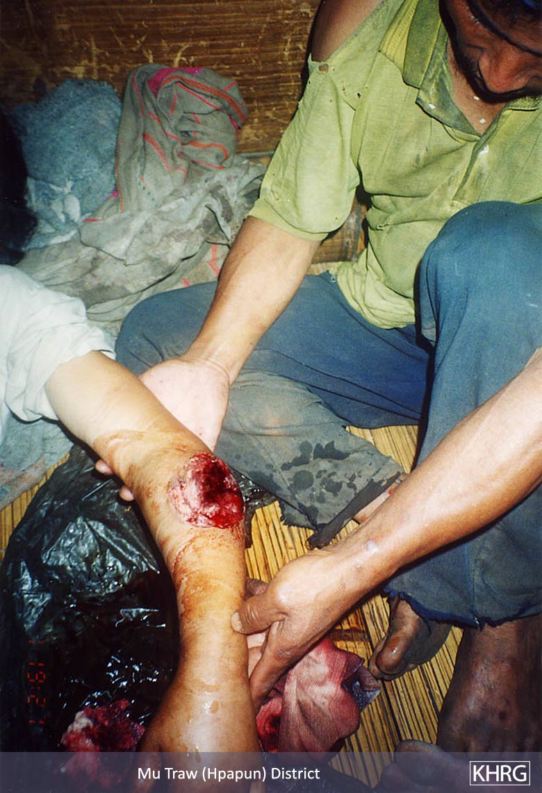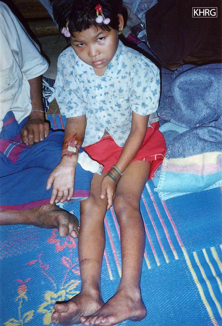 Photos #9-1, 9-2: Twelve year old Saw S--- from T--- village, Toungoo District, displays a wound that SPDC soldiers inflicted upon him when he was only six. At that time, he and his family were internally displaced, living in a hut in their ricefield. SPDC Army soldiers found the hut, quietly approached it and opened fire. He was struck in the arm as his father attempted to carry him to safety. The bullet shattered the bone in his forearm, rendering his right arm unusable. For villagers living in the forest, any encounter with SPDC forces can be disastrous. Many are simply shot on sight with no questions asked. Photo 9-1 was taken in January 2004, while photo 9-2 was taken seven months later in August 2004. Photo #11-19: Naw K---, age 16, from H--- village in southern Karenni (Kayah) State, was walking her younger siblings across Karenni toward the Thai border so they could attend school in one of the Karenni refugee camps in Thailand in April 2004, but along the way she stepped on a landmine laid by the Karenni Solidarity Organisation (KnSO), a Karenni armed group allied with the SPDC. She was later brought to a KNU clinic in Papun district, where this photo was taken as she was recovering in May 2004. KnSO mines are also involved in photos 11-32 to 11-36 below . [Photos: KHRG]