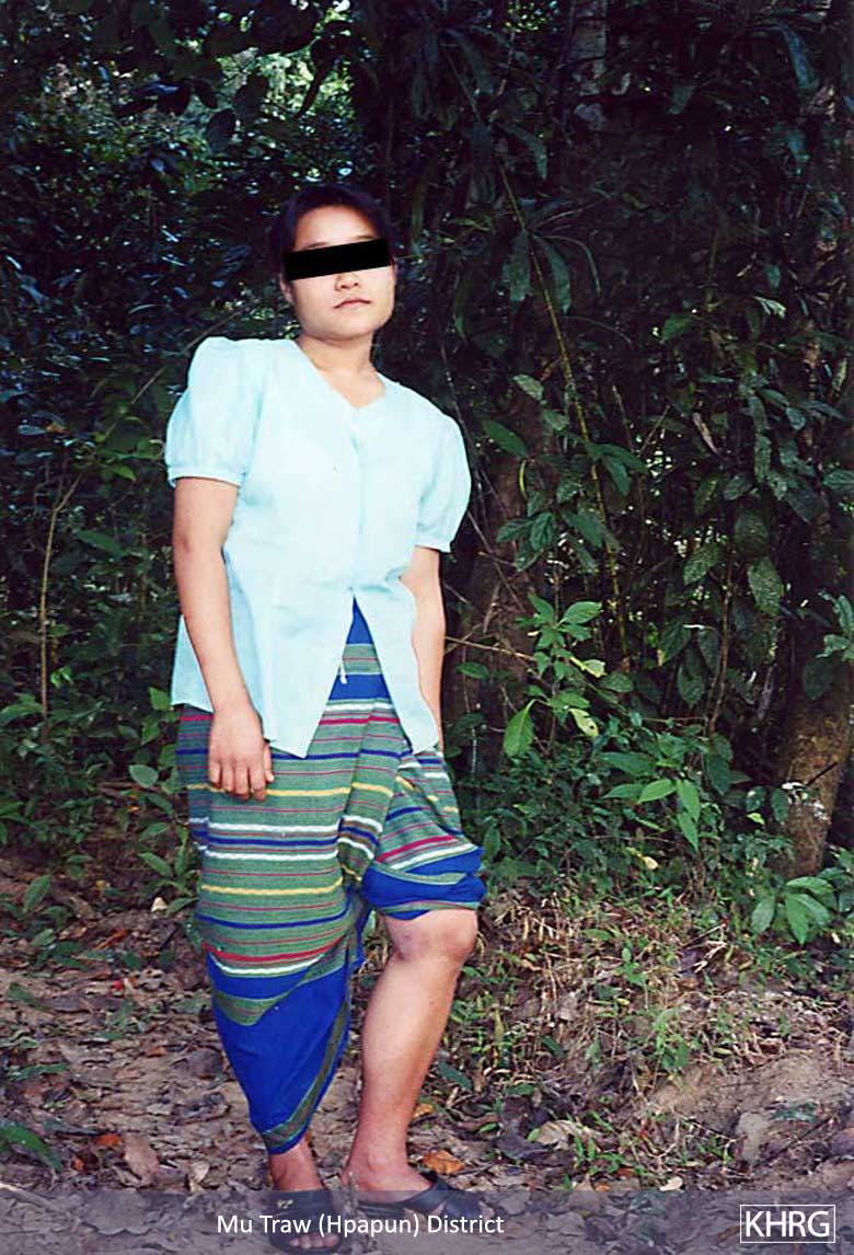 Photos # 11-37, 11-38, 11-39: On January 4 th 2003, SPDC LIB #341 (Kyaw Mya Thaung commanding) ordered villagers from P--- and K--- villages to carry Army supplies from Hsaw Bweh Der to K'Hee Kyo Army camp in Bu Tho township of Papun District. These girls aged 12, 15, and 20 were part of the group, which had to leave Hsaw Bweh Der at 7 a.m. The soldiers who were supposed to accompany the villagers set out for K'Hee Kyo through the forest, but ordered the villagers to walk along the vehicle road, apparently suspecting that the road may be mined. Shortly before arriving at K'Hee Kyo camp one of the villagers hit a tripwire, detonating a claymore mine placed there by the KNLA. Nine of the villagers were wounded. Photo 11-37 shows Naw A---, age 12, who was hit by shrapnel in the shoulder, left arm, left wrist, and under her breast; medics were later unable to remove the shrapnel, and a month later she said it still made her dizzy often. Beside Naw A--- in Photo 11-38 is Naw B---, 15 (left), who was wounded in the bladder; both girls are shown in school uniform. Photo 11-39 shows 20 year old Naw M---, who sustained shrapnel wounds to her left thigh. Four others were injured more seriously and were sent to the SPDC hospital in Papun town. The use of villagers as human minesweepers is a common SPDC tactic throughout all areas of Karen State. [Photos: KHRG]