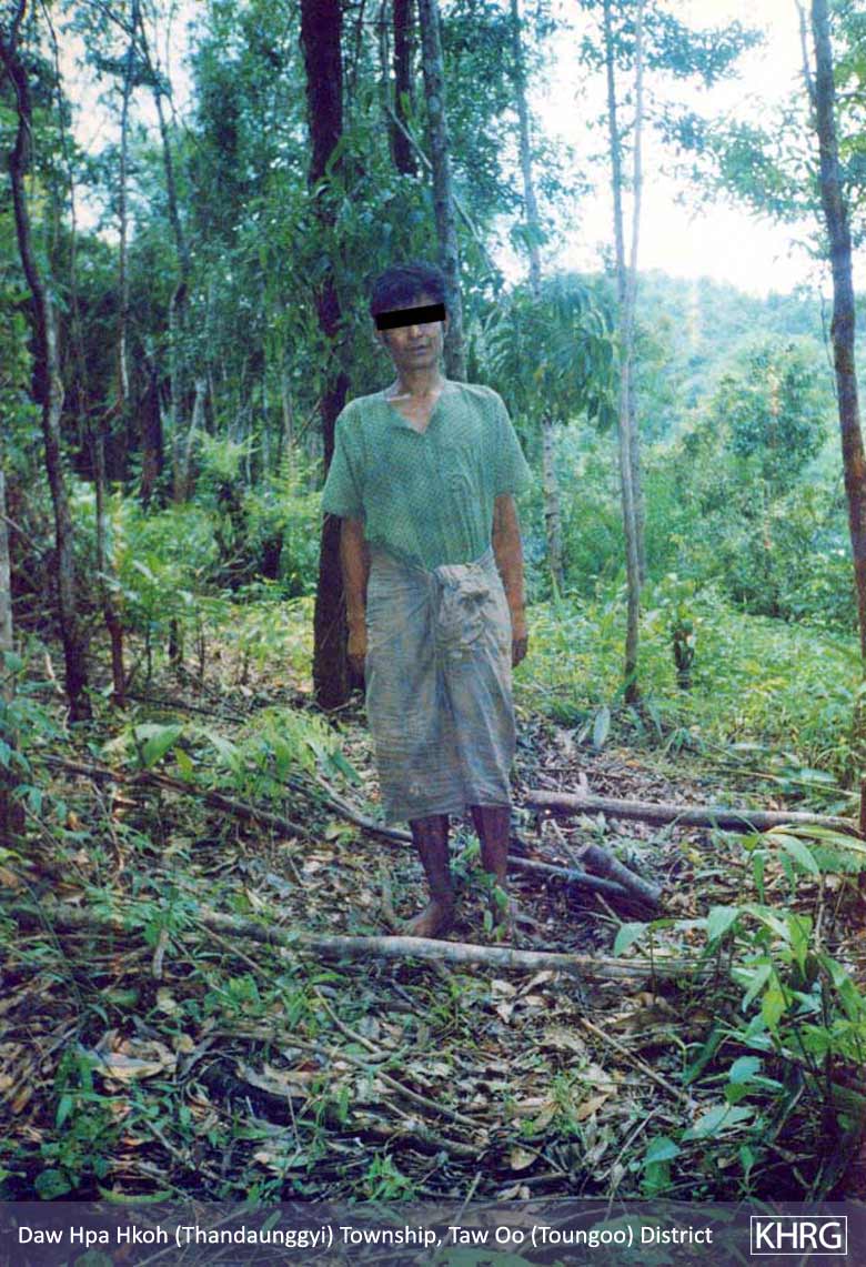 Photo # 11-50: 46 year old Saw K--- from N--- village in Than Daung township of Toungoo District lost his son to an SPDC landmine. Major Aung Ko Lin, battalion commander of IB #53, acting under the direct orders of Captain Thet Oo, Operations Commander of Southern Regional Military Command's Strategic Operations Command #3, planted many landmines along the banks of the Klay Loh River in early 2002. Saw K---'s son Saw Si Si Htoo was only 14 when he was killed outright by one of these mines while fishing in the Klay Loh River on April 26 th 2002. [Photo: KHRG]