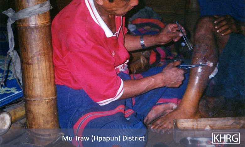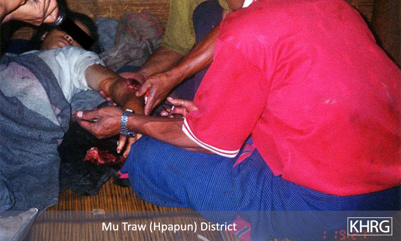 Photos # 11-32, 11-33, 11-34, 11-35, 11-36: On August 11 th 2003 Saw H---, a 17-year-old from B--- village in southern Karenni (Kayah) State, stepped on a landmine planted near his village by SPDC-allied Karenni Solidarity Organisation (KnSO) soldiers commanded by officer Hsa Wah. It was not until two months later that he reached this KNU clinic in Papun District, where this photo was taken. The medics decided his lower leg (shown in photo 11-32 ) could not be saved. The remaining photos show stages of the amputation, which is done with only the simple medical tools available and without general anaesthetic. Many of those who step on landmines die from loss of blood or shock long before they can be either taken to medical care or wait until it reaches them. KnSO mines are also involved in photo 11-19 above . [Photos: KHRG]