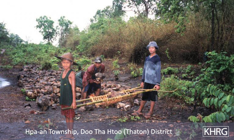 When large numbers of forced labourers are demanded, so many children are involved that village schools often close down. For example, when villagers in Thaton district had to gather stone for over two months from April to June 2004 to build a road for the SPDC, children often formed over half the workforce, especially because this work occurred when ricefields had to be prepared, ploughed and planted (see photos 6-115 to 6-118 and 6-119 to 6-122 ). Children are regularly involved in forced labour clearing the scrub along roadsides (see photos 6-25 to 6-34 , 6-168 to 6-171 , and 9-7 ), preparing and delivering thatch to SPDC and DKBA camps (see photos 6-227 , 6-228 to 6-236 , and 6-248 to 6-250 ), and even girls as young as 11 are forced to do the difficult and dangerous work of portering Army supplies (see photos 9-6 and 6-44 to 6-46 ).