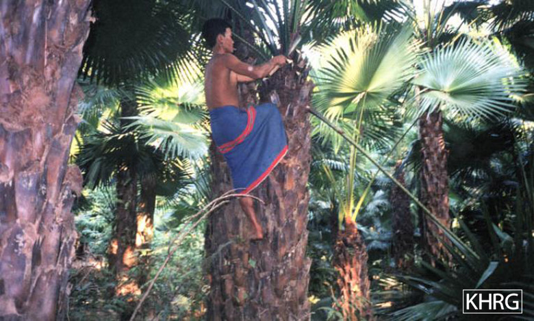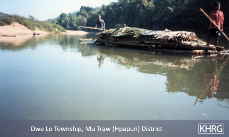 Photos # 6-228, 6-229, 6-230, 6-231, 6-232, 6-233, 6-234, 6-235, 6-236: Throughout January 2004, commander Zaw Lwin Htut of LIB #349 demanded large quantities of bamboo and roofing thatch from numerous villages in Dweh Loh township of Papun District. Each household in all of these villages was ordered to deliver six lengths of bamboo and five shingles of thatch to the Win Maung SPDC Army camp adjacent to the Wah Mu relocation site. Saw S---, 29, from P--- village told a KHRG researcher, " I had to go to send six pieces of bamboo and five shingles of thatch to the SPDC at Wah Mu. They are from LIB #349. The name of their commander is Zaw Lwin Htut. They didn't pay us; they forced us to work. If the people don't work they won't allow them to stay in the village. They said that people who don't go to do loh ah pay , portering, or set tha are not villagers [i.e. that they must be rebels]. If the people don't work they have to hire someone [itinerant labourers], and if they don't hire labourers then they have to leave." The villagers were not paid, nor were they provided with any tools or even food. Providing these materials is labour intensive. Photo 6-228 shows a villager from K--- village cutting fronds that will be used to make the thatch from his plantation of Loh (Cabbage Tree palm) trees. Bamboo must be cut in the forest, then split and shaved to make the frames for the thatch shingles. Photos 6-229 through 6-233 show people representing each house in K--- and M--- villages carrying their quota of thatch and bamboo to the Bilin river to be transported to the Army camp. At the riverbank the materials from several villages are laid out in piles so village leaders can count them (photos 6-234 and 6-235 ); if on arrival at the Army camp they are found to be one household short of the quota, the entire village will be punished. In photo 6-236 , one of many rafts sets out to deliver the materials to the Army camp. These photos were taken between January 8 th and 27 th 2004. Thatch is often demanded by Army camps to repair their own buildings, but when such large quantities are demanded it is possible that the SPDC officers plan to sell it for personal profit. Photos 6-237 through 6-240 in Section 6 and 6-248 through 6-250 below suggest that this may be the case, because they show that Wah Mu army camp demands large quantities of these materials from the villagers at least once every 3 months. [Photos: KHRG]