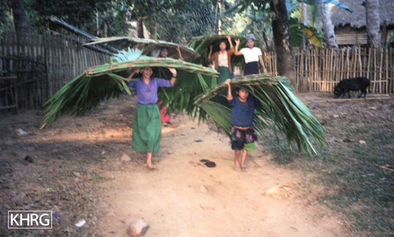 Photo #6-227: Villagers from W--- village in Dweh Loh township of Papun District providing roofing thatch to the SPDC in February 2004. Captain Lu Maung Htat, an officer of Military Operations Command ( Sa Ka Ka ) #9, ordered the villagers to deliver the thatch to the Ku Thu Hta Army camp. Children are involved because the family needs to work efficiently to get all their work done, which includes multiple overlapping demands for forced labour along with their own work. SPDC officers never object to the involvement of children as long as the work gets done. [Photo: KHRG]
