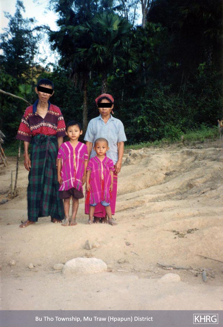Photo #9-12: On January 15 th 2003 SPDC troops from LIB #434 passed through villages in Bwa Der village tract of Bu Tho township, Papun district on their way to a post on the Salween River (see also photos 10-107 through 10-113 in Section 10 ), causing villagers throughout the area to flee into the forest to avoid capture. These two children from N--- village were among those who became internally displaced persons when they fled with their families. Photo #9-13: These children from G--- village in Papun District were forced to flee with their parents when SPDC Army soldiers entered their village early in 2003. They were still living in the forest when this photo was taken in February 2003. Photo #4-14: 35-year-old Naw E--- from P--- village in Ler Doh township of Nyaunglebin District was arrested, interrogated and beaten by soldiers from SPDC IB #60 because her husband works with the KNU. She is shown here with her three children, who had to flee with her in order to avoid further repercussions. This photo was taken in February 2003. [Photos: KHRG]