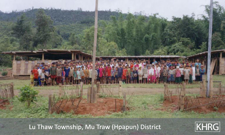 Karen students studying in a village middle school, Lu Thaw township, Papun district. These schools are often targeted for destruction because they are not SPDC-controlled, and they often have to close when SPDC troops are active in the area and villagers have to go into the forest. The second Photo shows the primary school at L--- in Papun district in August 2005. The villagers run this school themselves with local teachers and little outside support. The school is close to an army camp occupied by SPDC Infantry Battalion #42, so it frequently has to close. The last photo shows Students and the teacher of Hee Ko Theh primary school in Papun district pose in front of their school. This school can only open when there is not much SPDC activity in the area; some years it is entirely closed. In difficult times parents need their children to care for younger siblings and do other work for the family, and may only feel able to spare one child for schooling – in such situations it is usually boys who are sent to school, as reflected in the high proportion of boys in this photo. [Photos: KHRG]