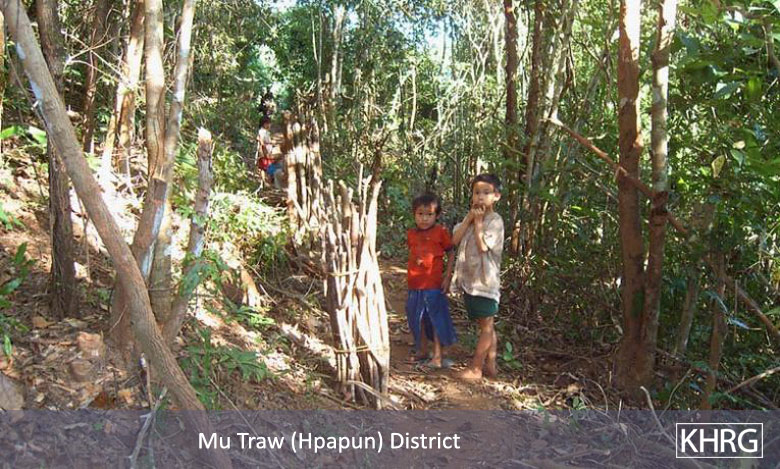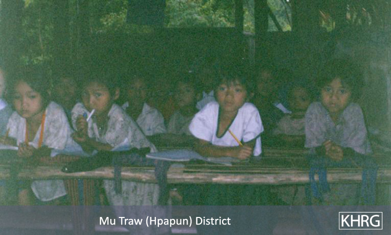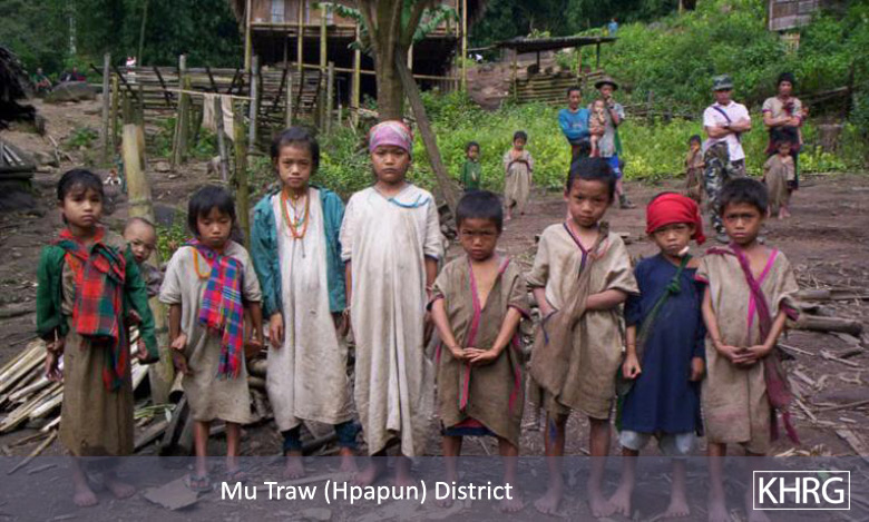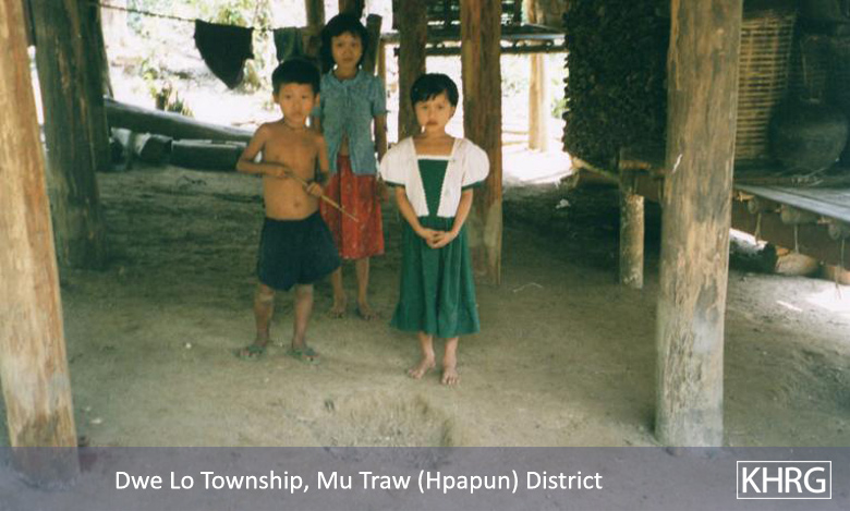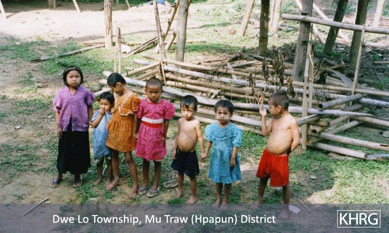 Children in H--- village, Dweh Loh township, Papun district in May 2005. There is no school in their area so they cannot study. The SPDC does not support any schools nearby and if the villagers or the KNU try to establish schools they are deliberately destroyed by SPDC troops. [Photos: KHRG]
