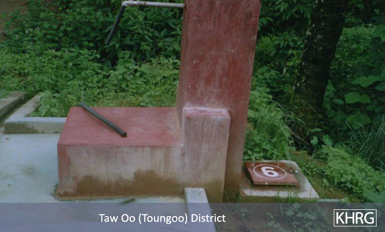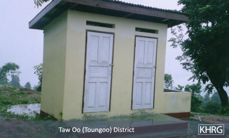 This public water pipe and the toilet block at Kler Lah middle school in Toungoo district were built with funding from the International Committee of the Red Cross (ICRC), the only international agency to have a presence in Toungoo district. The ICRC in Kler Lah has local but no expatriate staff and focuses on small-scale projects like these. No projects occur in any village except Kler Lah, causing people in other villages to comment that the ICRC presence is making no difference. Villagers in Kler Lah say that the ICRC projects have been beneficial but have had no effect on the monthly extortion and forced labour demanded of them by the SPDC, or the food and goods shortages they face every time the SPDC closes the roads. [Photos: KHRG]