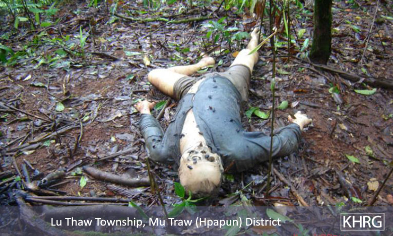 The body of a convict porter killed by SPDC troops from MOC #15 while operating around Dta Paw Der and Dta Meh Der villages in the Bilin River area, Lu Thaw township. [Photo: KHRG]