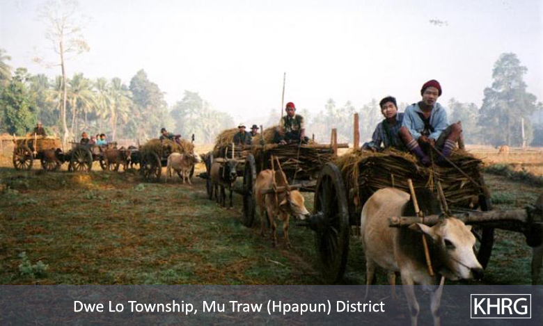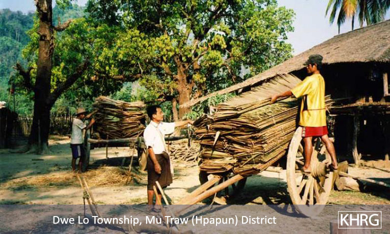 Villagers from H---, Htee Th'Blu Hta village tract, Dweh Loh Township load thatch onto bullock carts as ordered by K'Saw Wah battalion of DKBA Brigade #777 in March 2006. They were also ordered to pay 100,000 kyat. [Photo: KHRG]