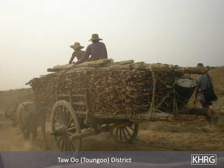 These photos, taken on March 13th 2009, show men from Sh--- village, Tantabin Township, as they return from collecting firewood and roofing materials. Travelling without permission from the Burma Army, they had to be wary of encountering soldiers. Four days earlier, SPDC soldiers near Th--- village had seized a group of villagers also transporting thatch by ox cart. The villagers and oxen were held at the Y--- army camp until the Th--- village head could arrange payment of 150,000 kyat (approx. US $141.51) to secure their release. [Photos: KHRG]