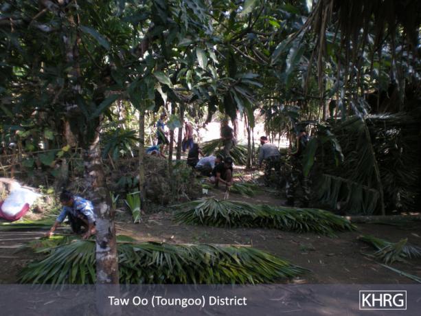 The first photo shows villagers hiding in upland Toungoo who still face severe food shortages in spite of the reduced SPDC presence. Villagers in this photo, taken on July 3rd 2009, wait to receive support from an aid group based in Thailand. The group lives at the Ht--- hiding site in Tantabin Township, a full day walk from the meeting place shown here. In the second photo, taken on December 16th 2008, villagers from T--- village prepare leaf thatching. In this case, villagers were able to use the thatching to repair the roofs of their huts in preparation for the 2009 rainy season. Villagers are also often required to prepare such materials for the SPDC army. [Photos: KHRG]