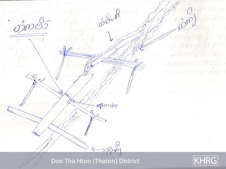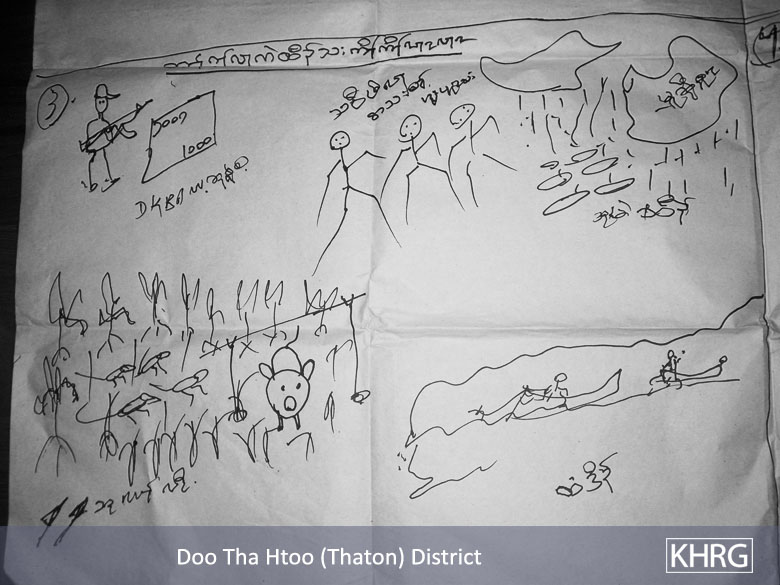 Mostly flat and home to agricultural land, Thaton District is under fully consolidated SPDC control and with few spaces to which villagers can flee to seek safe refuge from abuse. Functionally captive, in some cases literally because of stringent movement restrictions, villagers must balance already precarious livelihood conditions against the exploitative demands of SPDC and DKBA soldiers. "The villagers cannot avoid these abuses," a researcher reporting from the area told KHRG in June. "There is nowhere to flee and there is no money to pay. People just have to stay poorly in their villages."