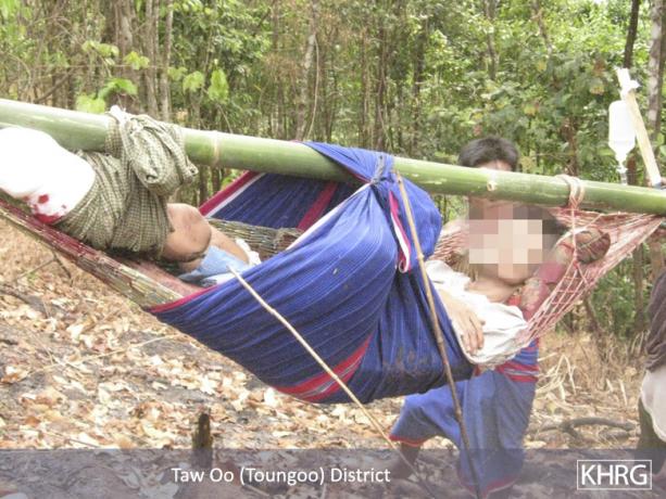 This photo, taken on March 29th 2010, shows Saw Pu--- being assisted by other villagers. The villagers put him in a stretcher constructed from a hammock slung from a bamboo pole to carry him to Ba--- for treatment. [Photo: KHRG]