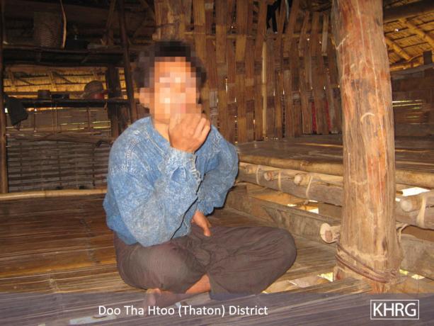 This photo, taken in March 2011 by the villager who conducted this interview, shows Saw H---, 34, who became the head of N--- village after a 23-year-old villager stepped on and was killed by a landmine in early 2011, while returning with Saw H--- from forced portering for Border Guard soldiers at Meh Bpa. After this incident, the previous village head was afraid to continue in the position, so Saw H--- took over.[Photo: KHRG]