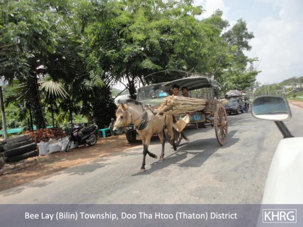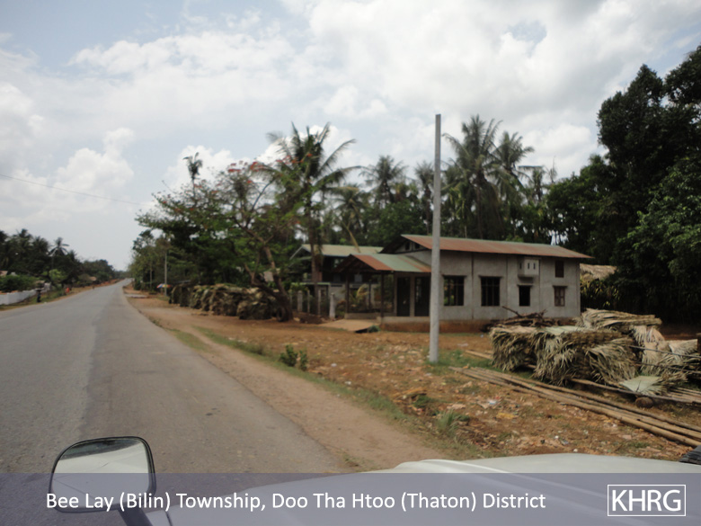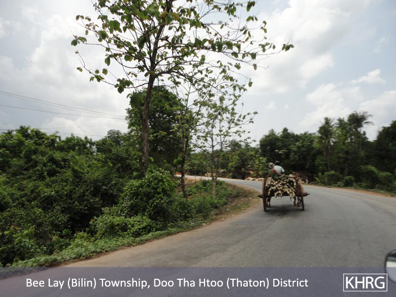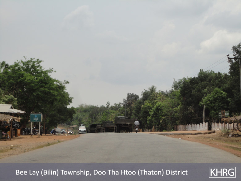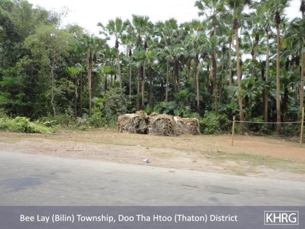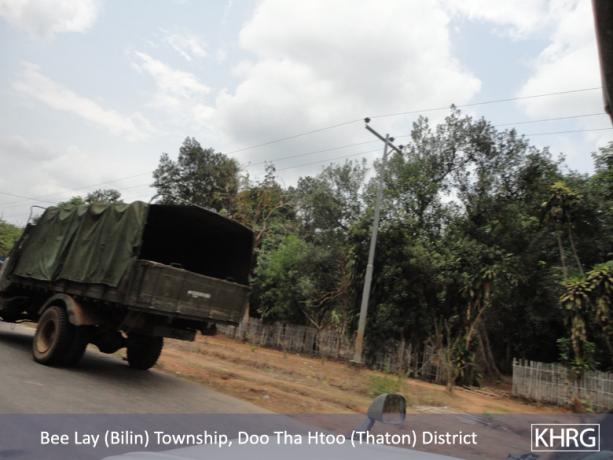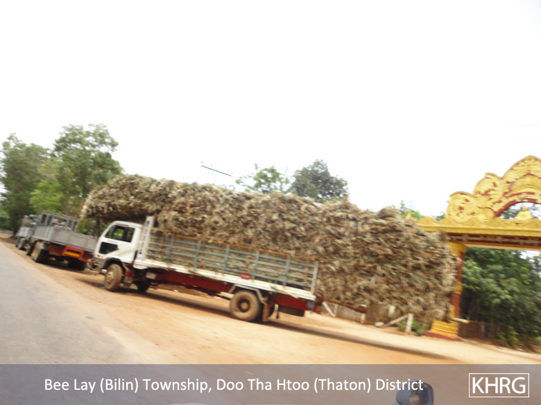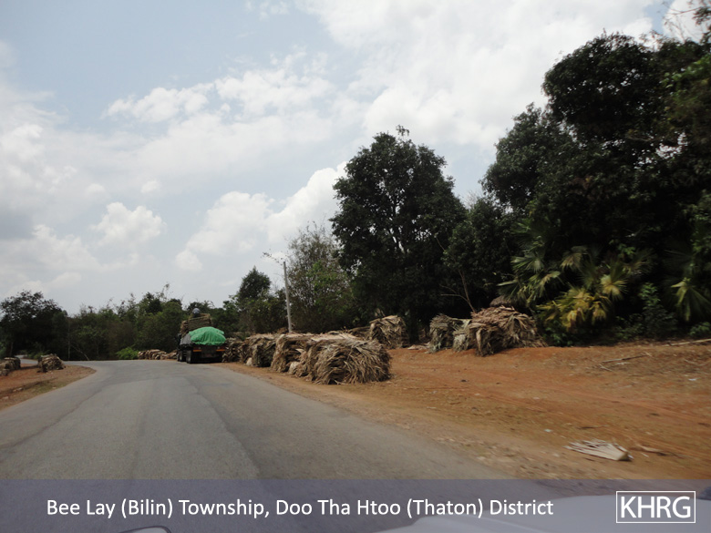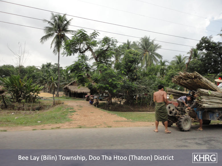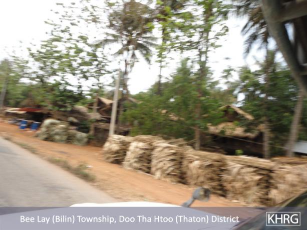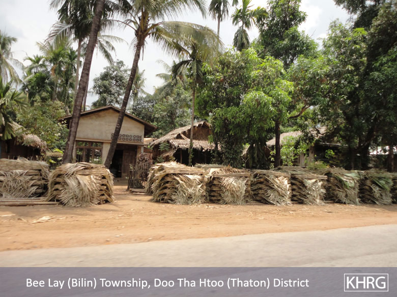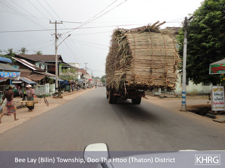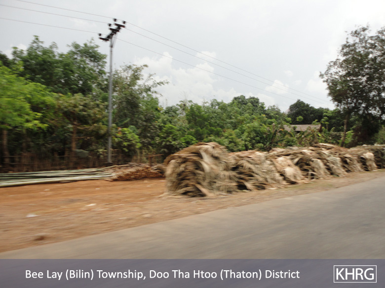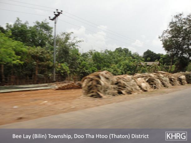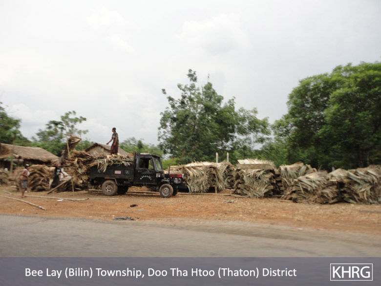 Meanwhile, a KHRG staff member travelling between Thaton and Kyaikto towns on April 7th 2012 passed through Bilin and Kyaik Khaw towns and witnessed thousands of thatch shingles and bamboo poles stacked along the main road and more than 10 military trucks carrying thatch shingles and bamboo poles in both directions towards Yangon and Mawlamyine. In at least three different places, the thatch or bamboo was being loaded actively onto trucks or tractors at the roadside, while soldiers and four empty military trucks stood in the middle of the road outside the LID #44 camp at Wunhtaw, obstructing traffic on the road in both directions.