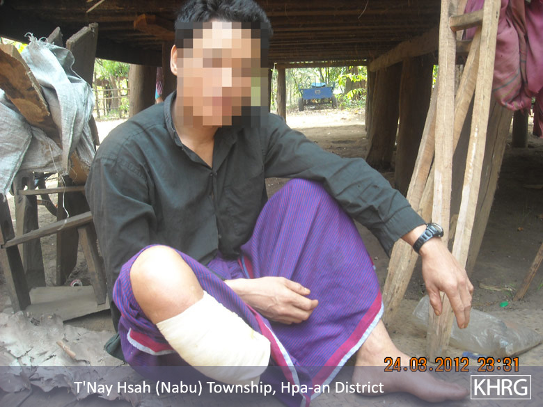 This photo, taken on March 2012, shows Saw Ng---, 32-years-old, from Noh Kay village tract in T’ Nay Hsah Township, Pa’an District, after he stepped on a landmine while fishing. [Photo: KHRG]