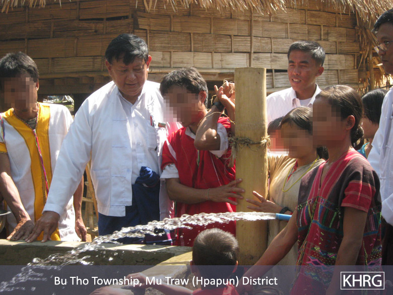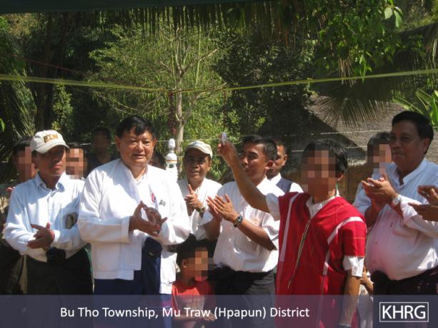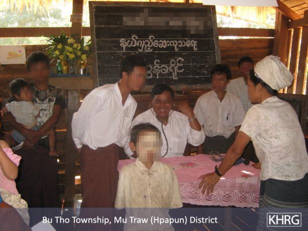 These photos, taken on February 11th 2012, show Burma government members from Papun District when they came to introduce a hydroelectric power supply in C--- village. They arrived in C--- village with a famous Burmese doctor, left, and two nurses, right, to provide medical treatment and medicines. [Photos: KHRG]